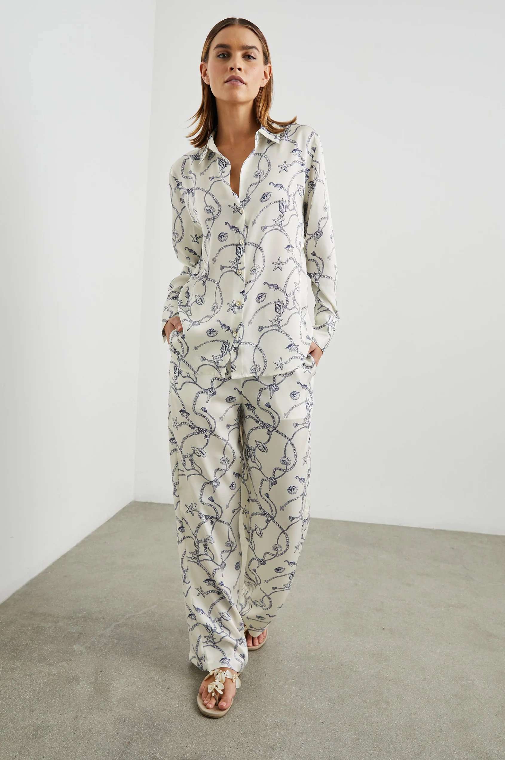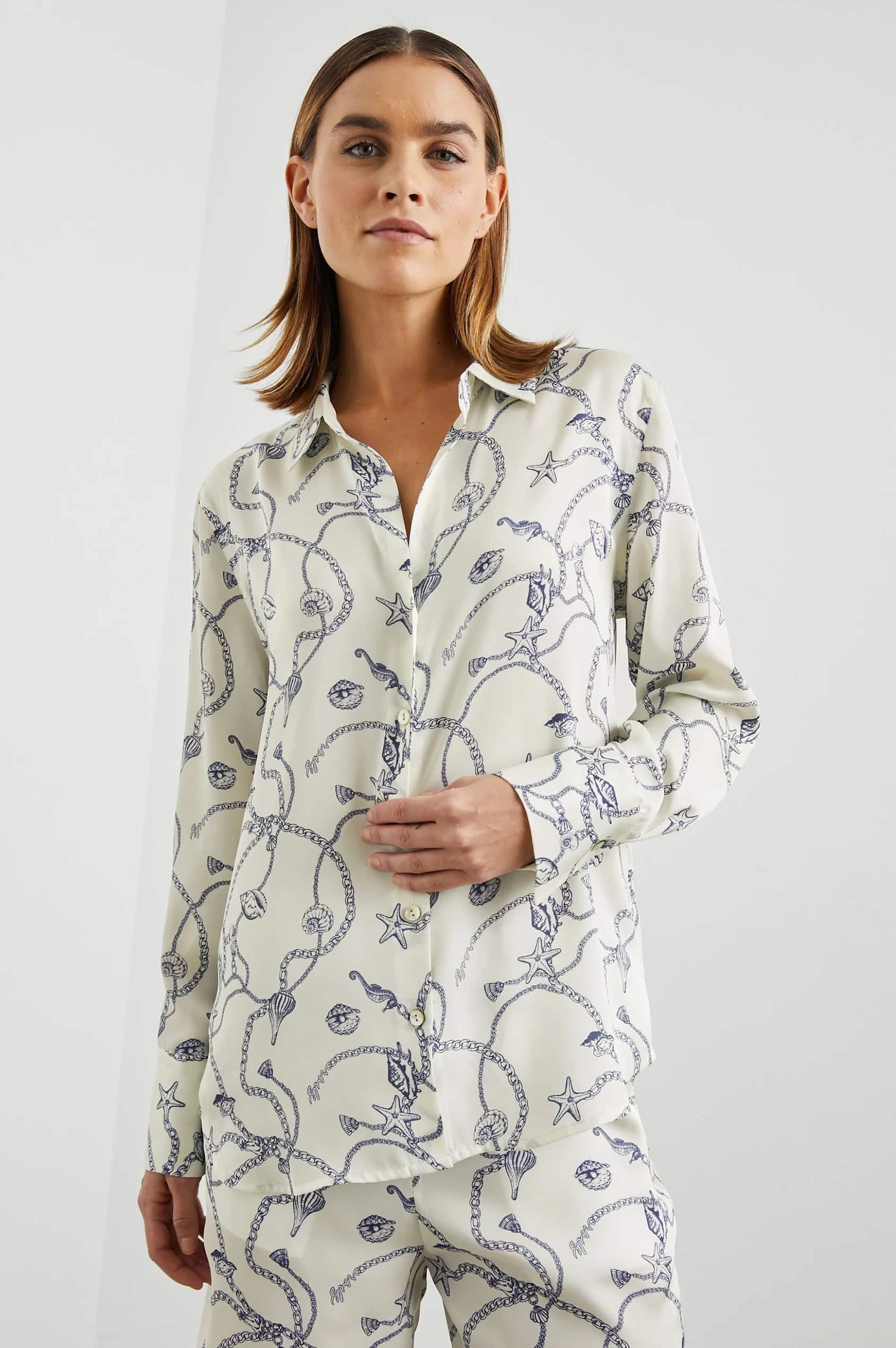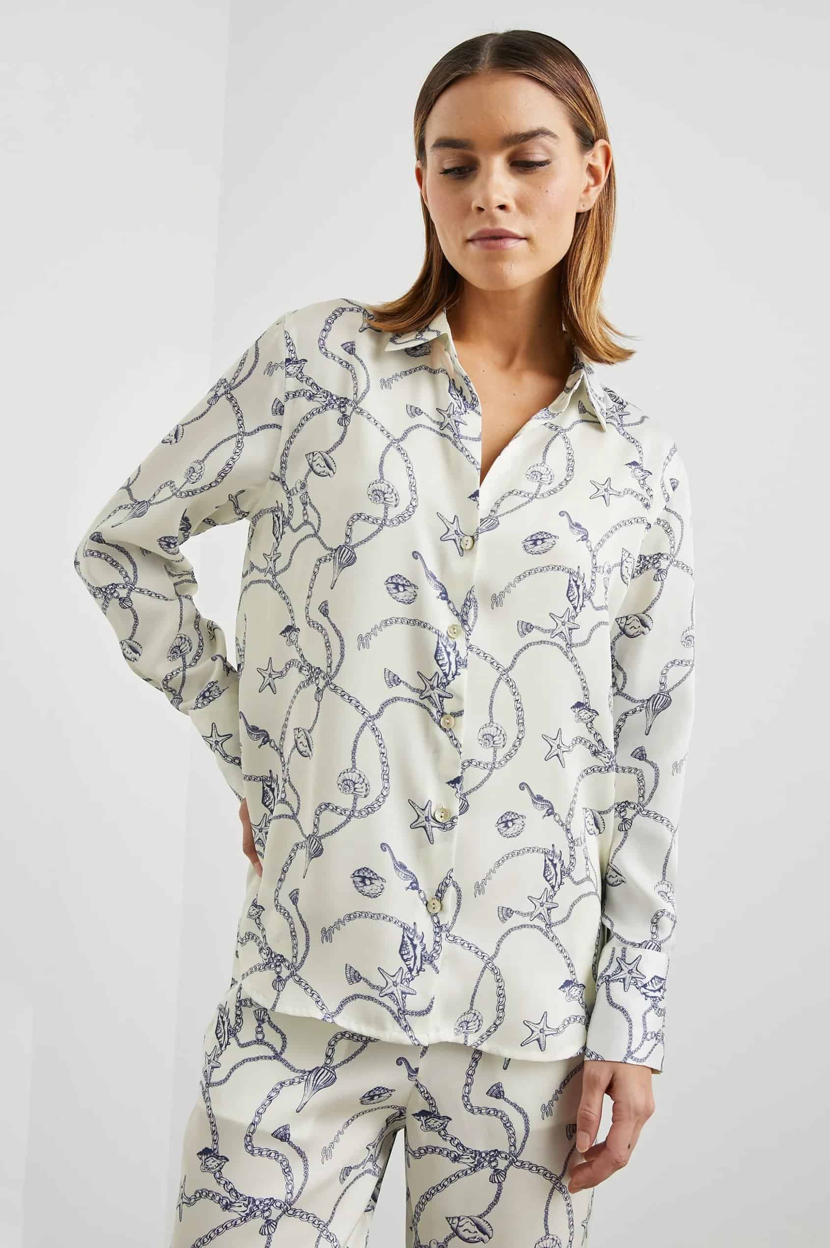 The Rails Ledger shirt in nautical chain is a sleek button down shirt with a relaxed body and long sleeves that features an all over nautical print design. Designed in a shiny twill, this shirt is an easy way to elevate your style, simply wear with your favourite denim jeans or for a stylish luxe look, style with the coordinating Rails Damani Trousers Nautical Chain. It also looks great worn over bikinis.