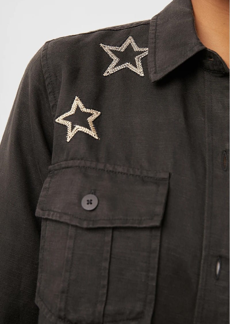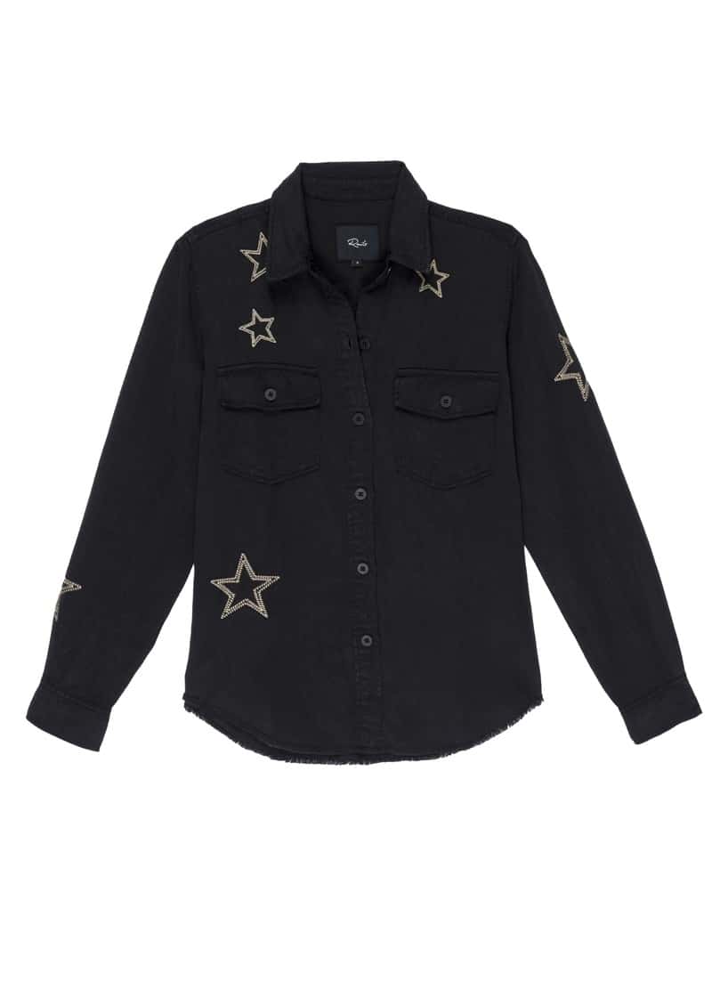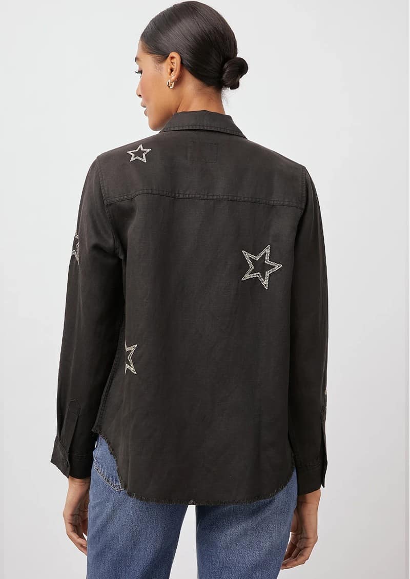 The Rails Loren shirt in black metallic stars is a slightly washed black, collared button down shirt jacket featuring metallic gold star embroidery. The shirt is the perfect addition to any wardrobe and will quickly become a wardrobe staple. The military details including patch pockets at chest, metal buttons and raw hem look great when teamed with denim whether it is worn on its own as a shirt or worn open over a t-shirt.