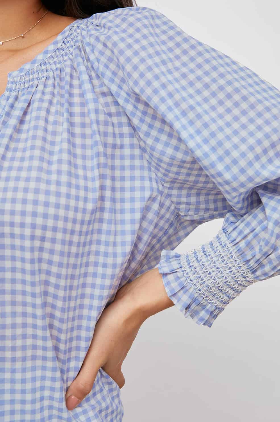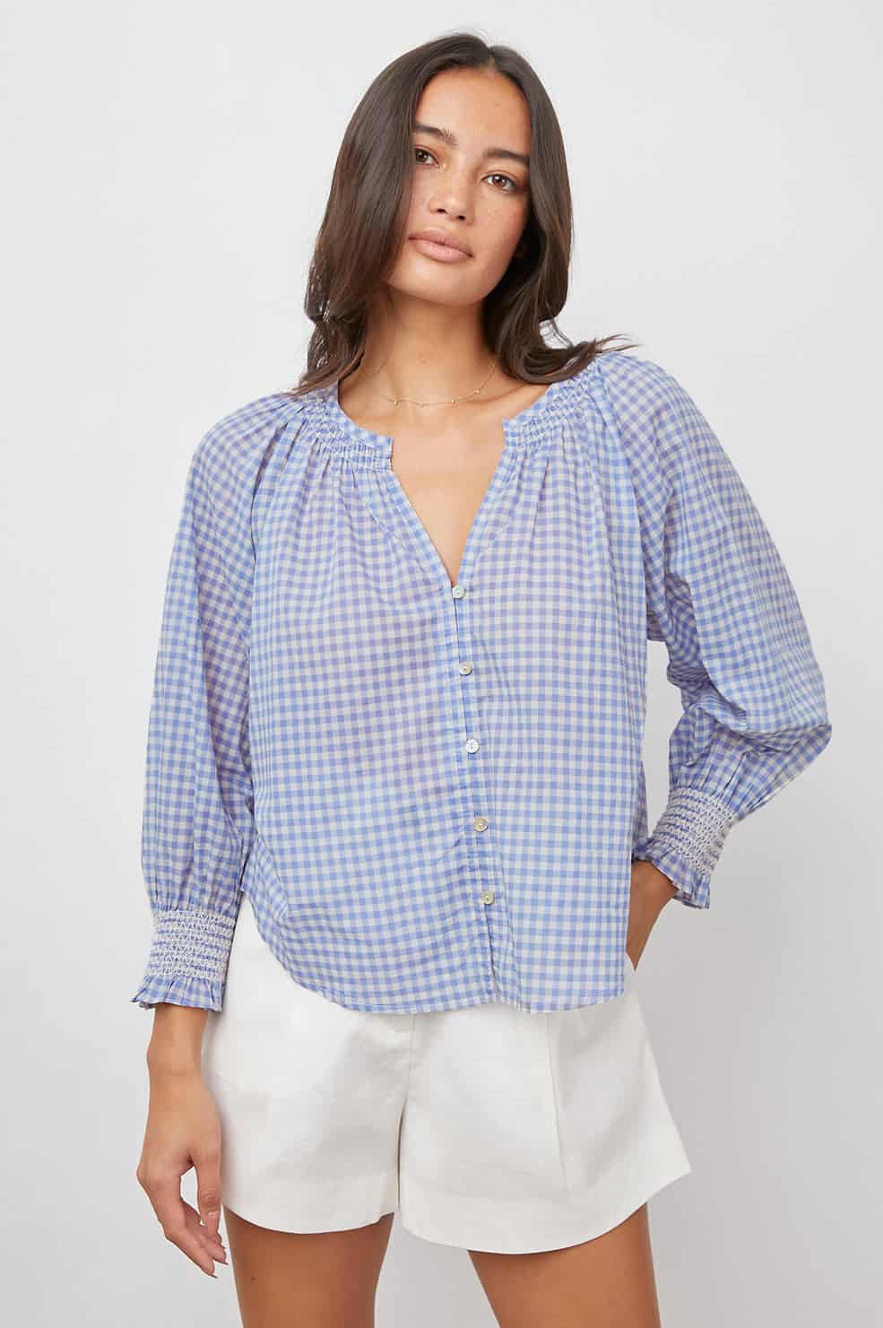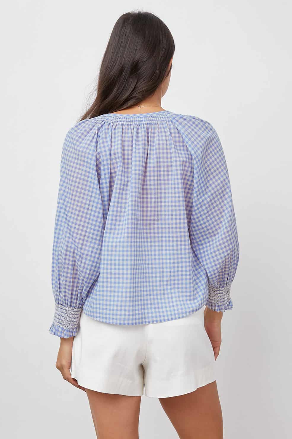 The Rails Mariah Top in Blue Carolina Gingham is lightweight and made from beach cotton. This pretty pullover top features natural shell buttons, elastic smocked detailing at cuffs, and a relaxed fit.