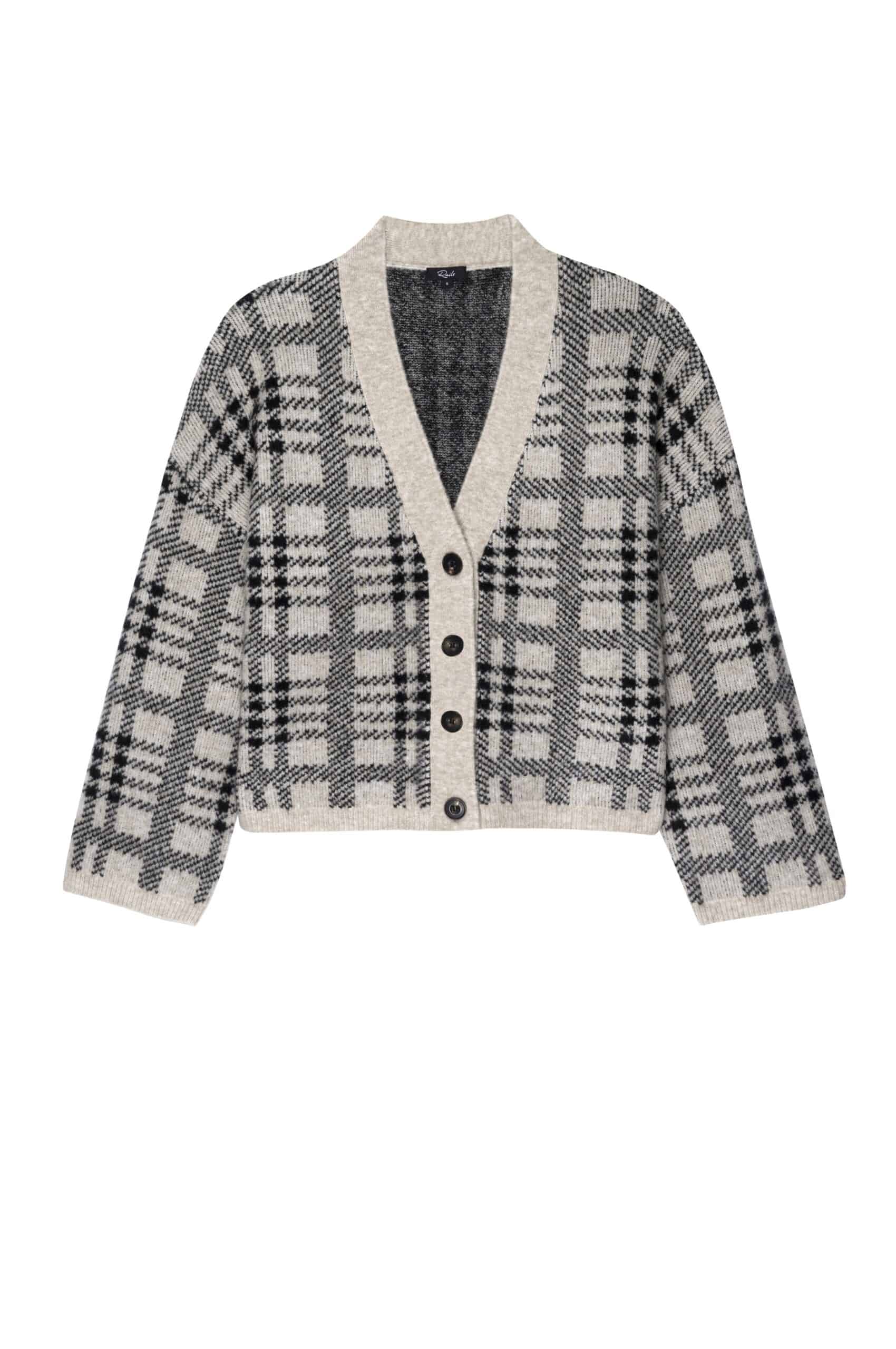 The Rails Reece cardigan in black oatmeal plaid is a stylish wool blend cardigan with a beautiful black plaid jacquard design on an oatmeal base. The button front cardigan can be worn open or worn on its own as a jumper and the medium weight ensures that you stay warm in a statement knit. Style with leather trousers or denim for a stylish day to night look.