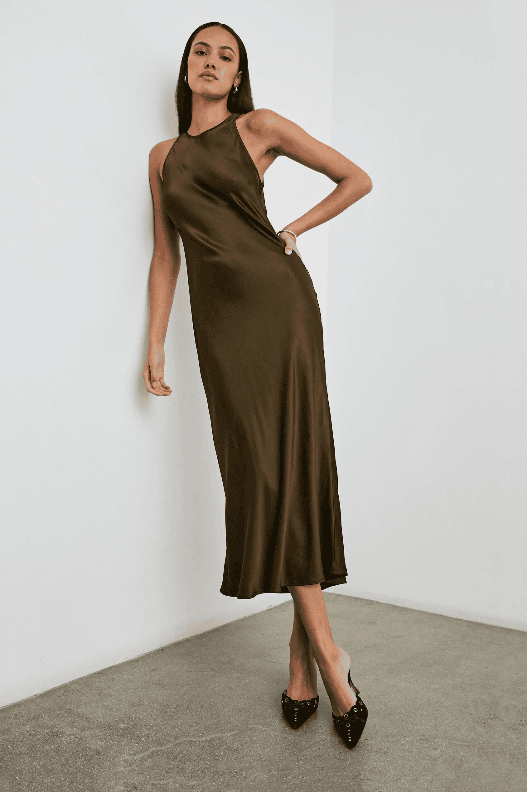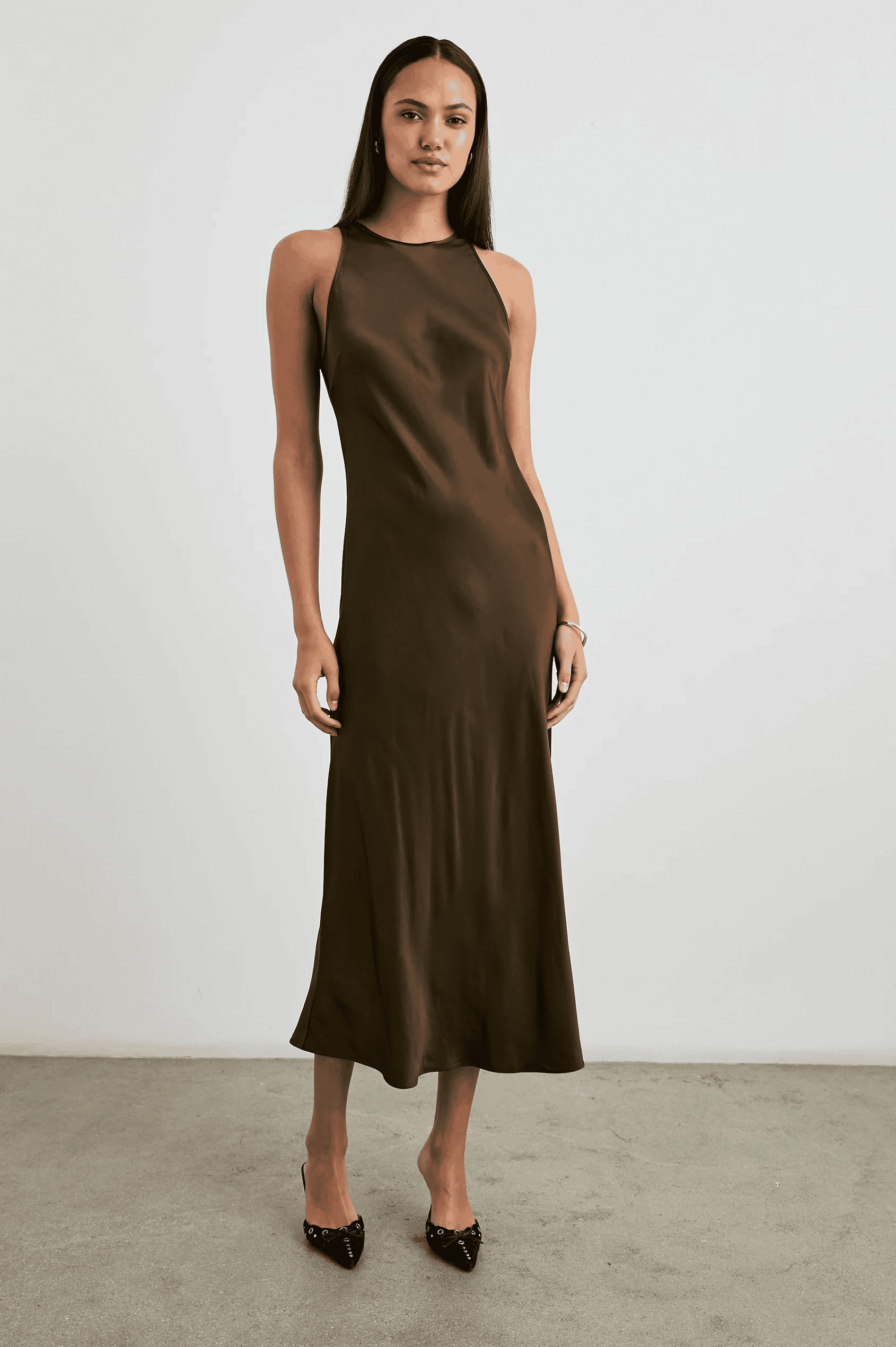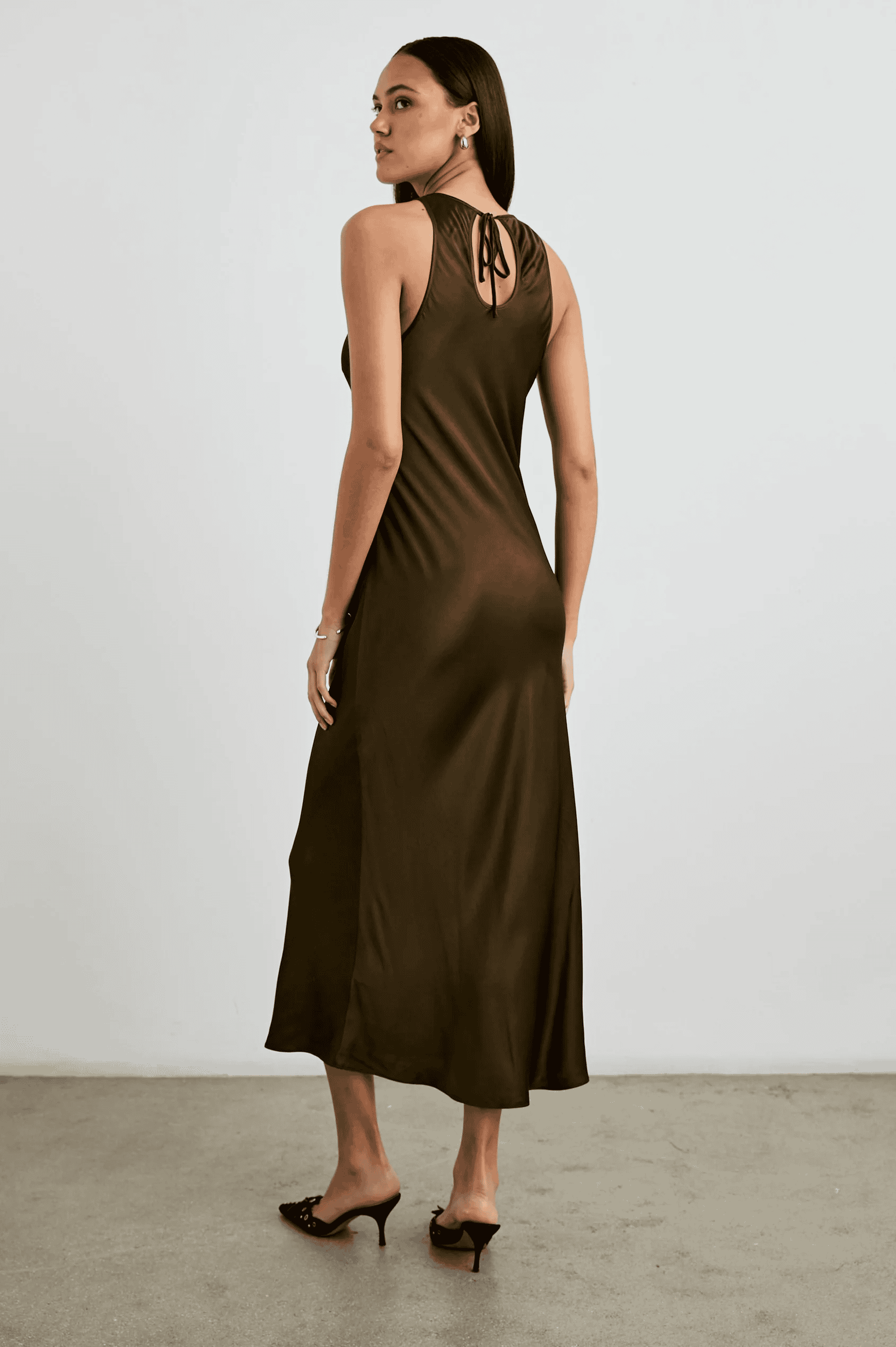 Rails Solene Dress in dark moss will add some statement luxury to your wardrobe. This dress is made with a lightweight and breathable rayon and viscose in a this seasons hue, dark brown. It also features a unique lustrous look and an adjustable keyhole closure at back.. Wear this dress with a heel and a blazer for a dressed up evening look or pair with an oversized knit and boots or trainers for a casual but elevated outfit.