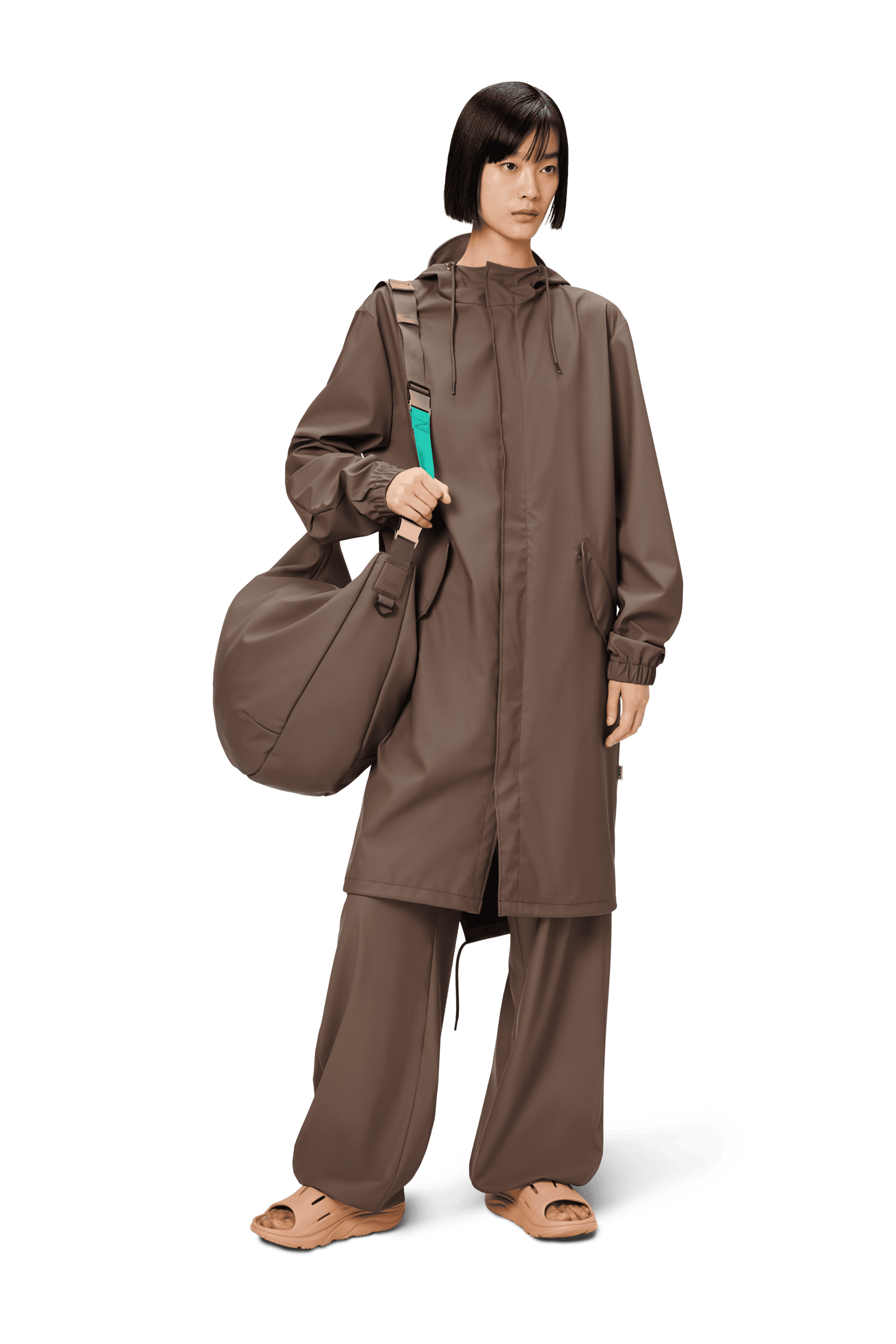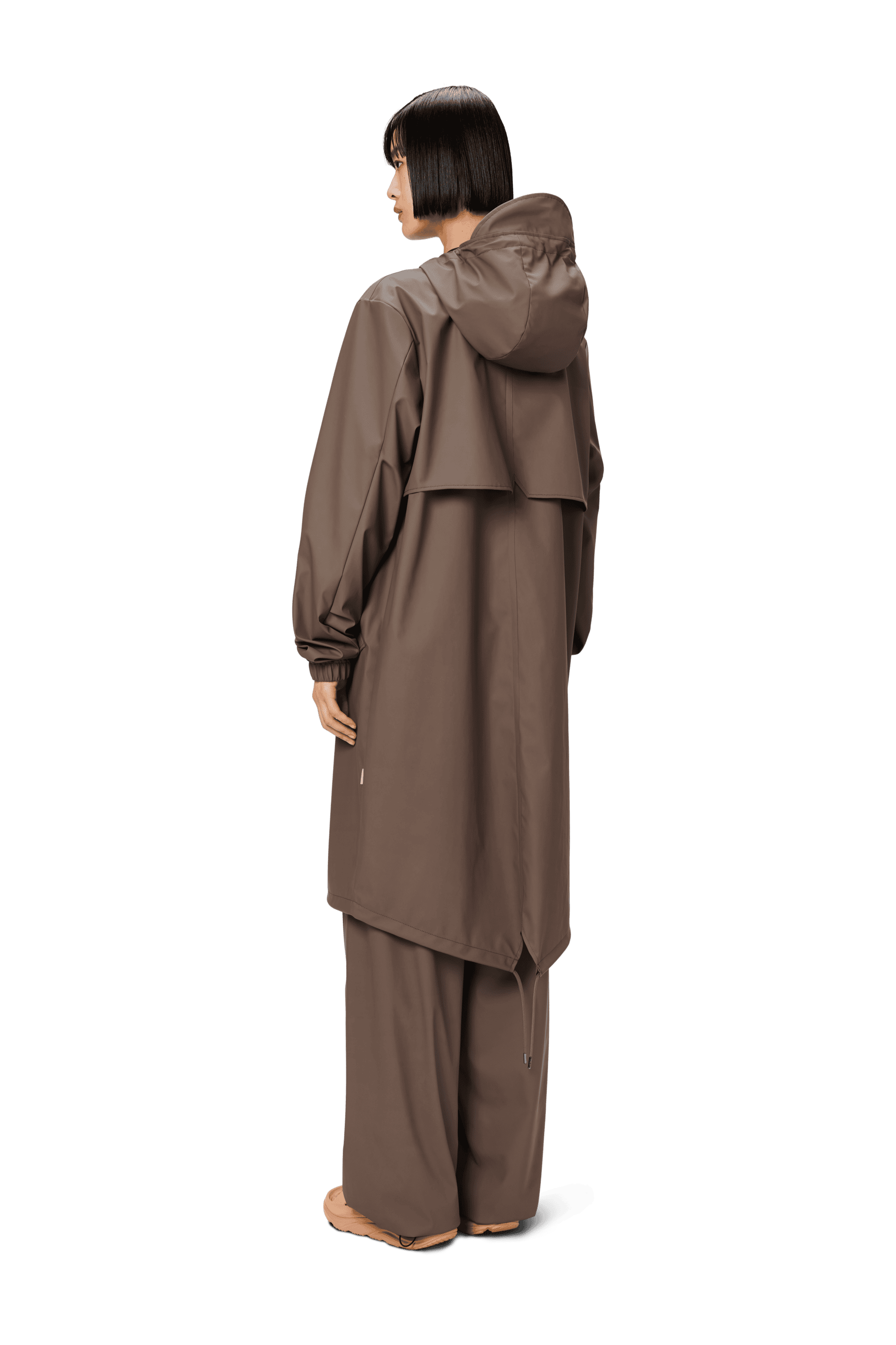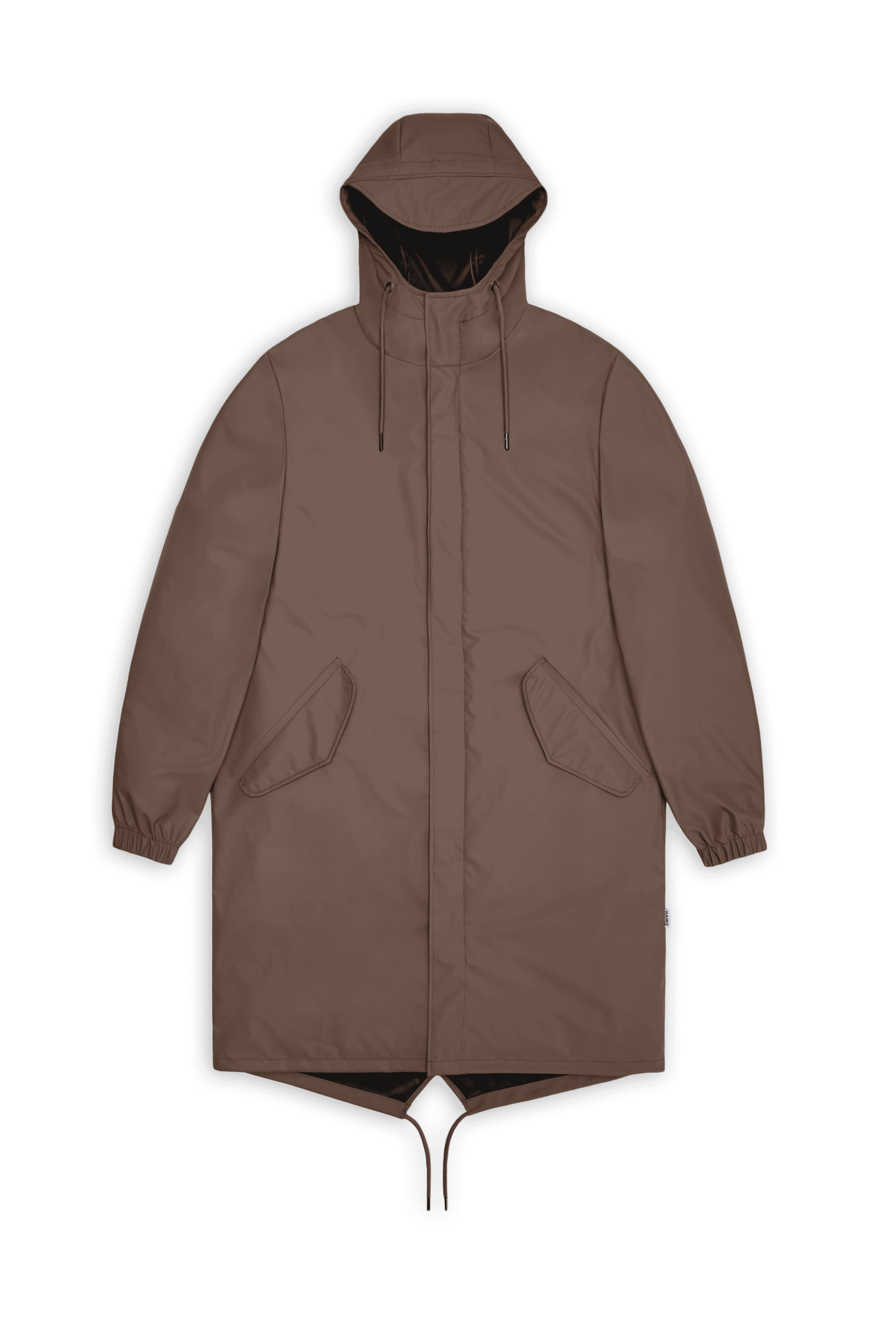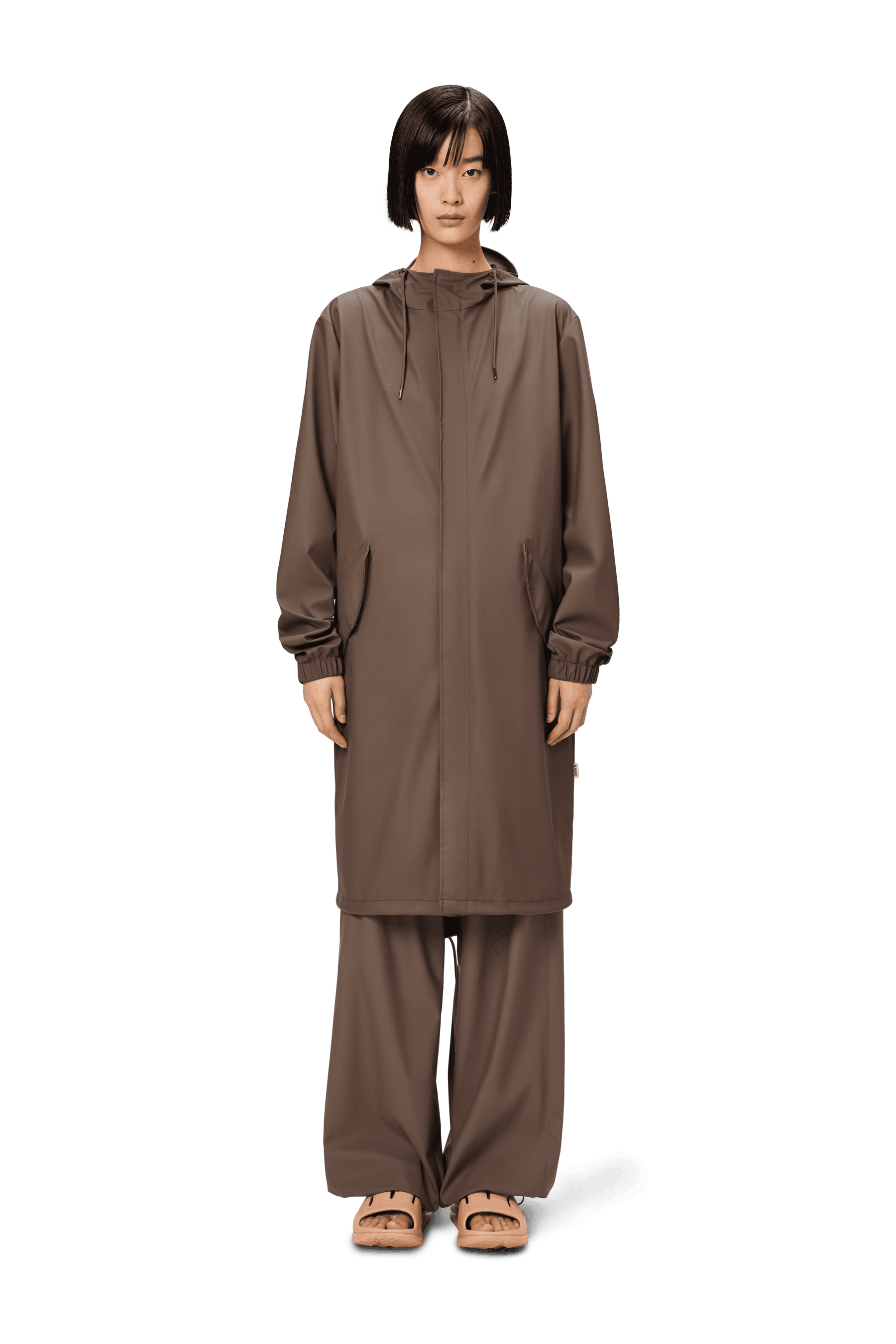 The Rains Fishtail Parka in shade is a unisex raincoat. Characterized by its pared-back aesthetic and drawstring fishtail hem in parka-length.