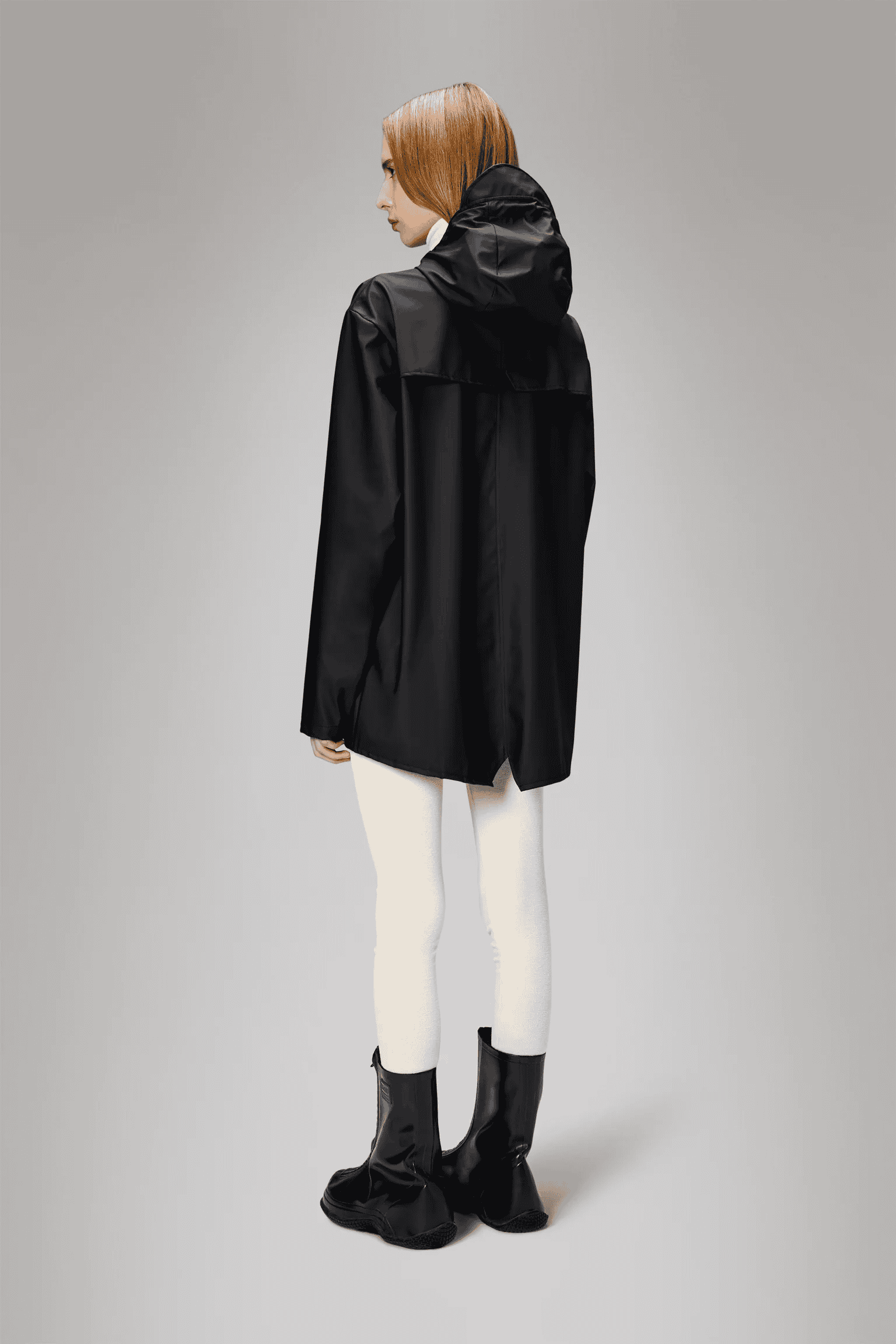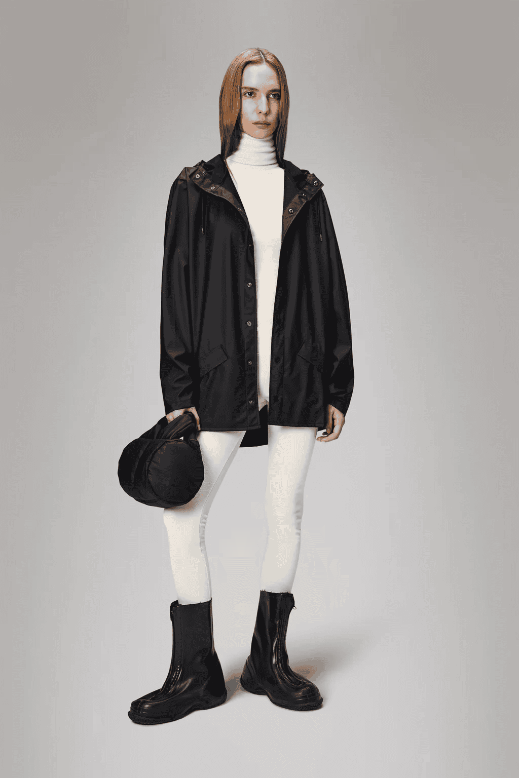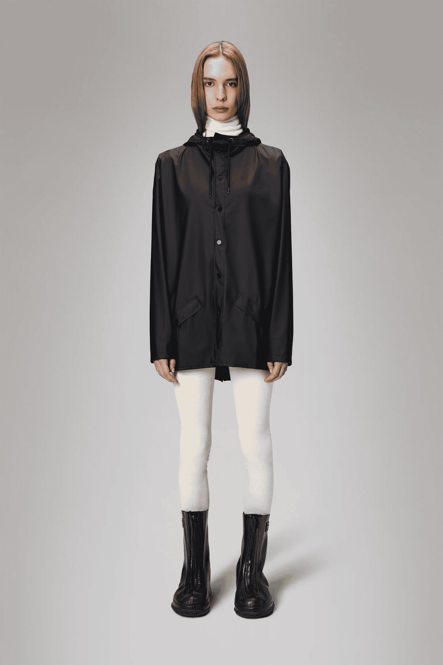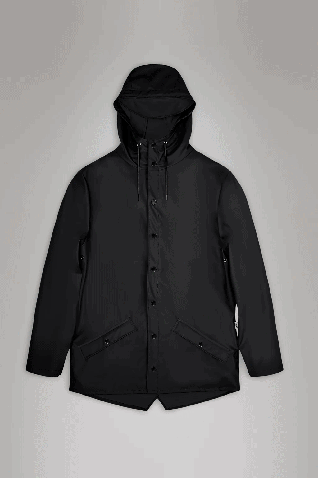 The Rains Unisex Jacket W3 black Jacket is an everyday unisex rain jacket. Characterized by a minimal silhouette with high functionality. This rain jacket features snap fastenings for closure, hood with built-in cap and two side pockets with snaps. Sleeves are finished with snaps making them adjustable for a loose or tight fit. This jacket is easy-to-wear with an elegant drape. The unisex rain jacket is completed with under-arm eyelets and a back yoke with concealed vents for breathable comfort.