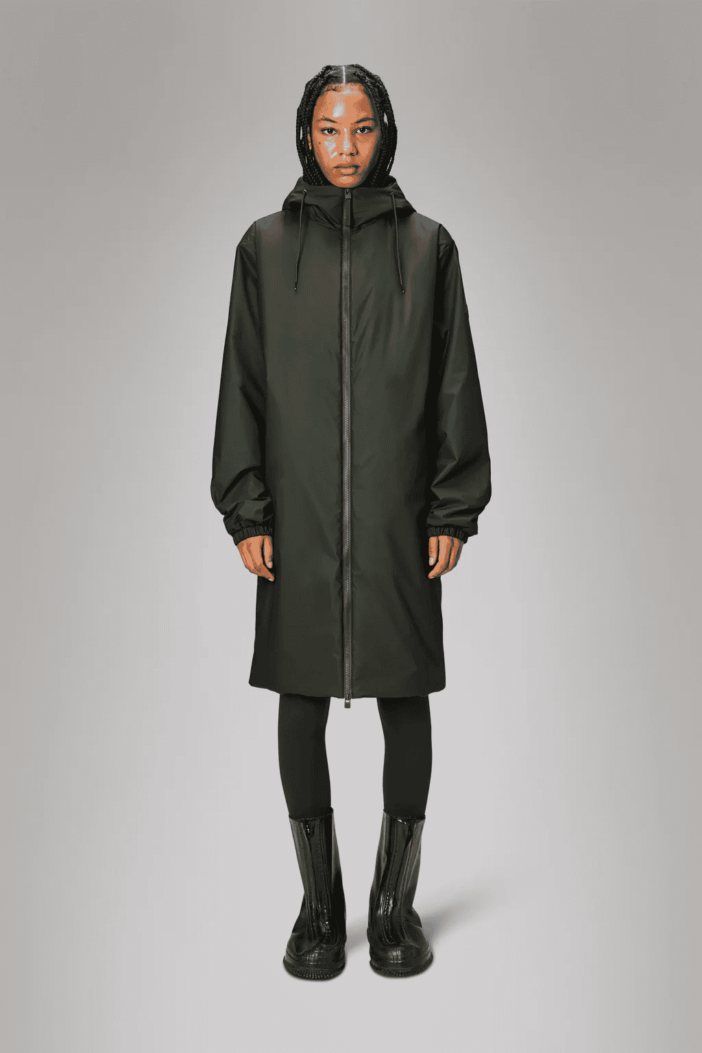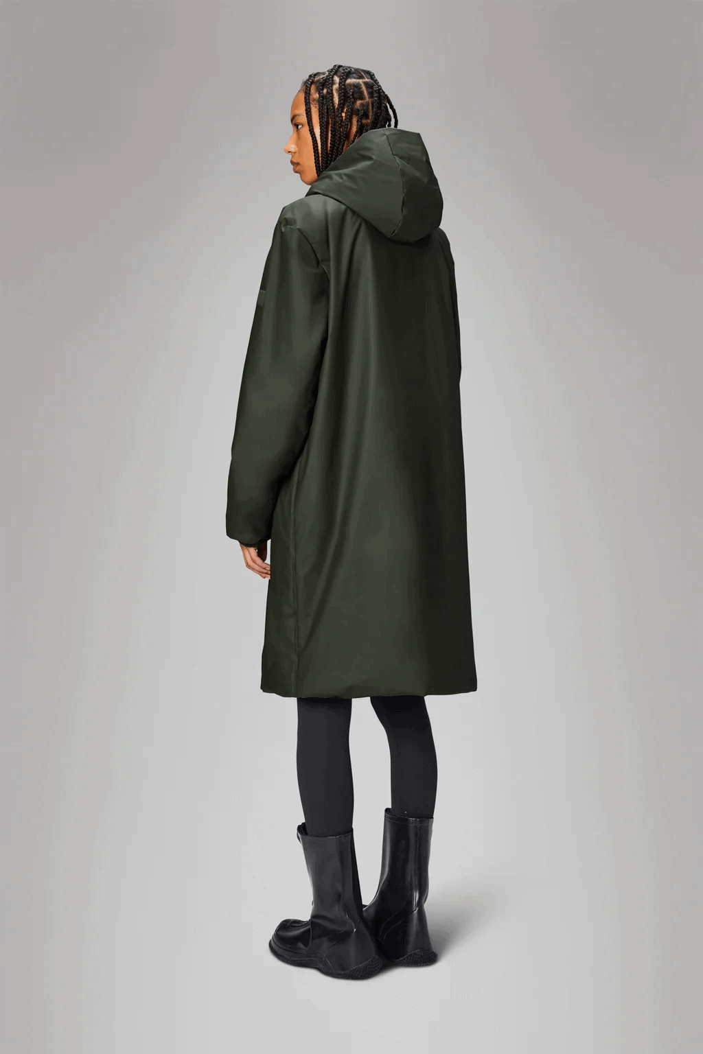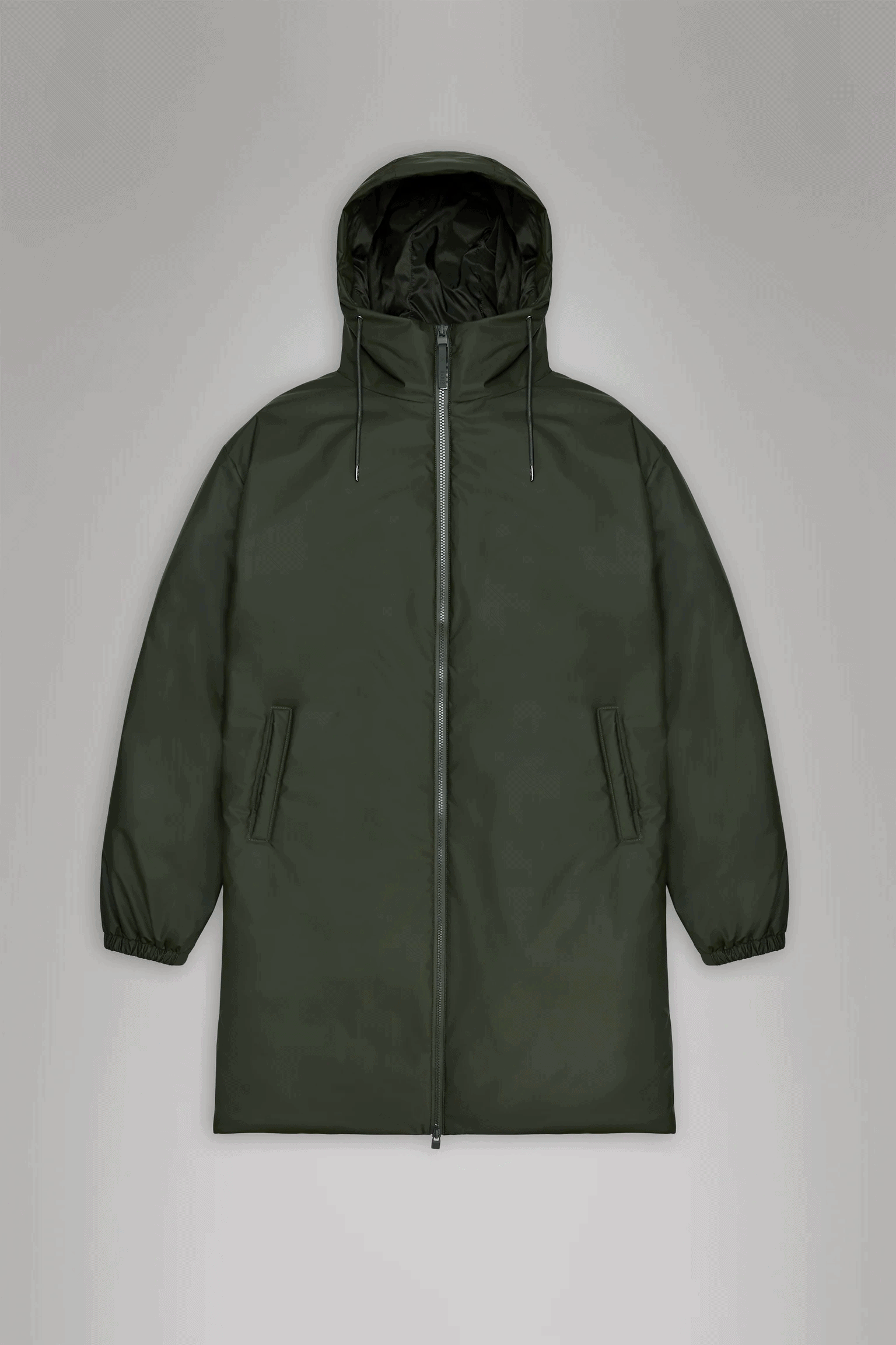 The Rains Lohja longer insulated jacket in green is a lightweight transeasonal piece in a longer silhouette. The jacket is a combination of style and practicality, with features including fleece lined side pockets, elasticated cuffs and an insulated hood with a drawstring.