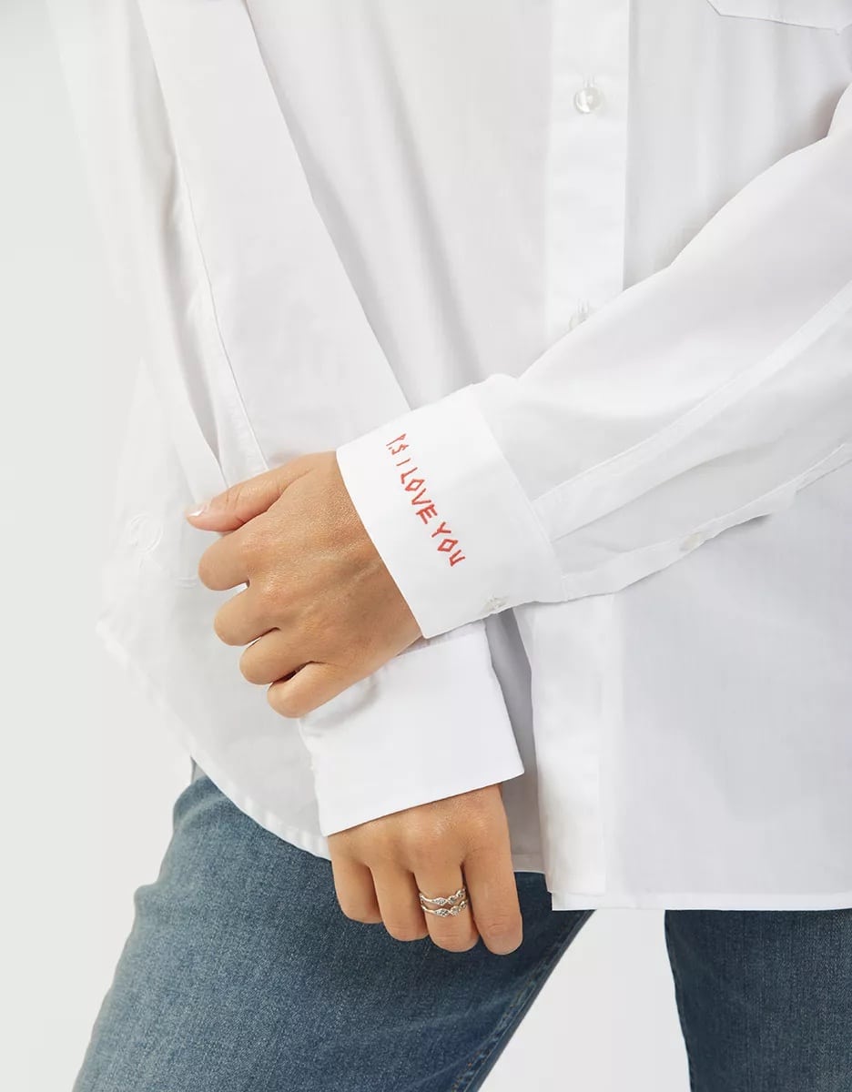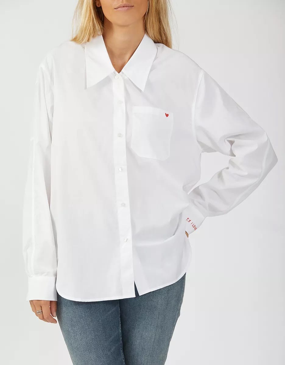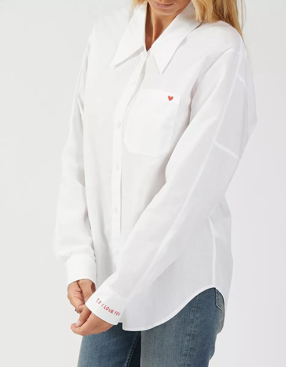 The Reiko Caleb shirt in white is the straight cut, long sleeve shirt with a wide collar that every wardrobe needs. The Caleb has romantic detailing, including a red "PS: I love you" embroidery on the cuff and a red heart embroidered on the front pocket. Perfect for a stylish yet modern chic look.