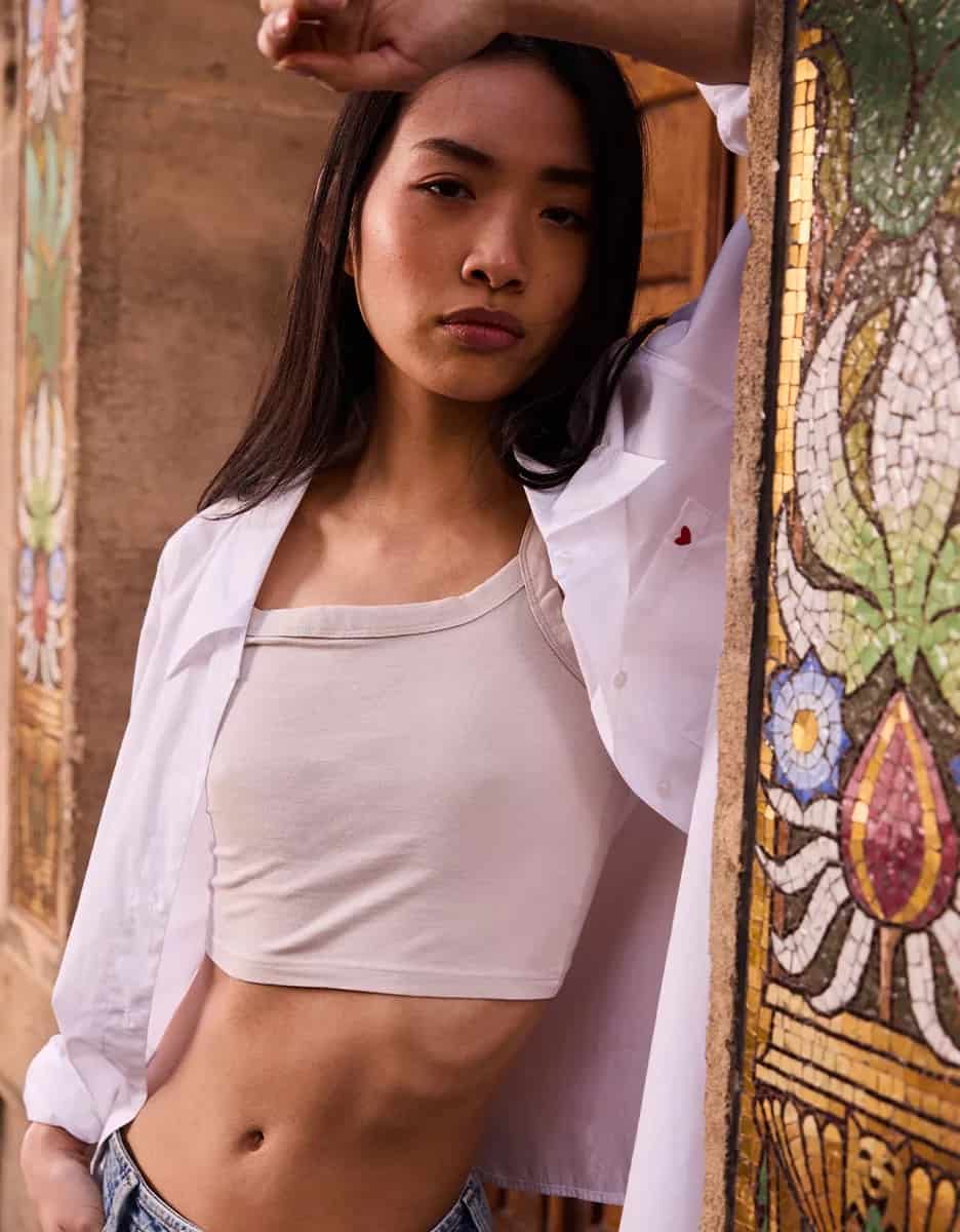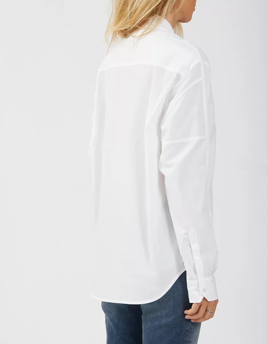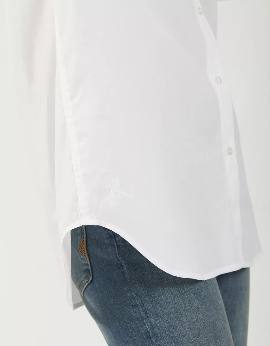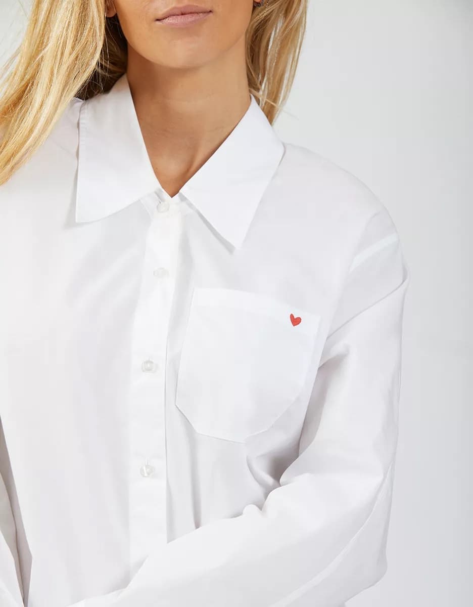 The Reiko Caleb shirt in white is the straight cut, long sleeve shirt with a wide collar that every wardrobe needs. The Caleb has romantic detailing, including a red "PS: I love you" embroidery on the cuff and a red heart embroidered on the front pocket. Perfect for a stylish yet modern chic look.