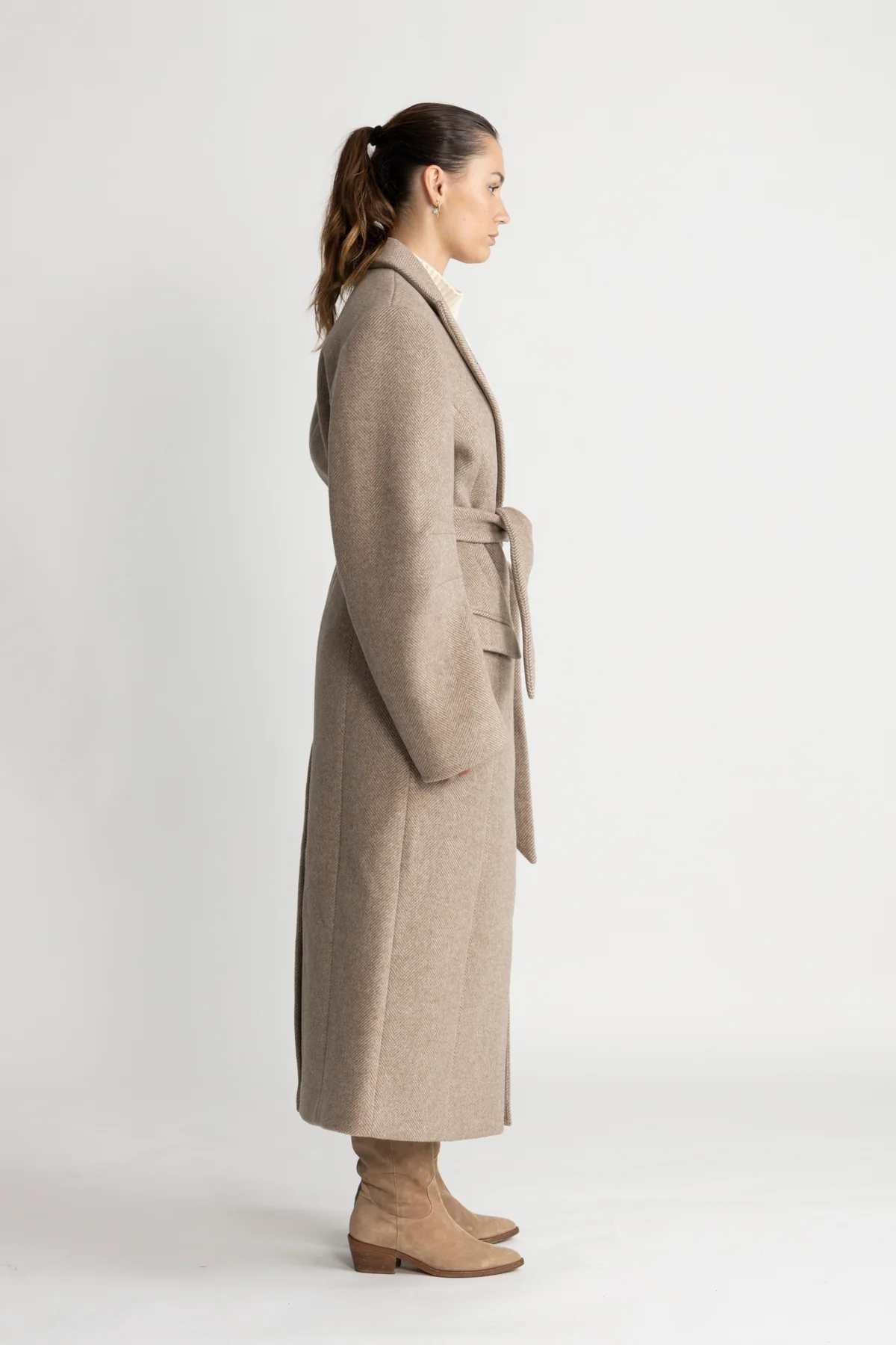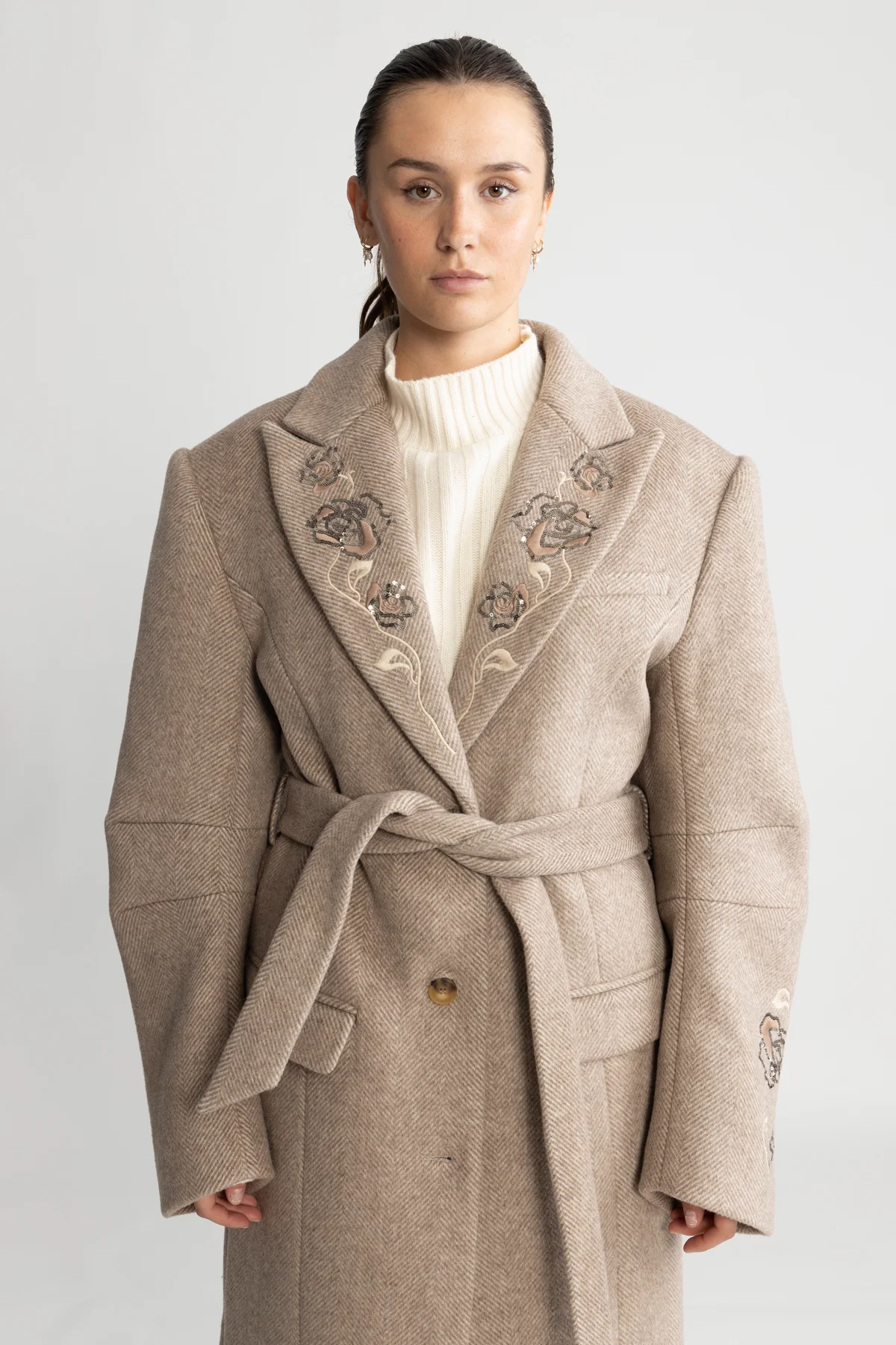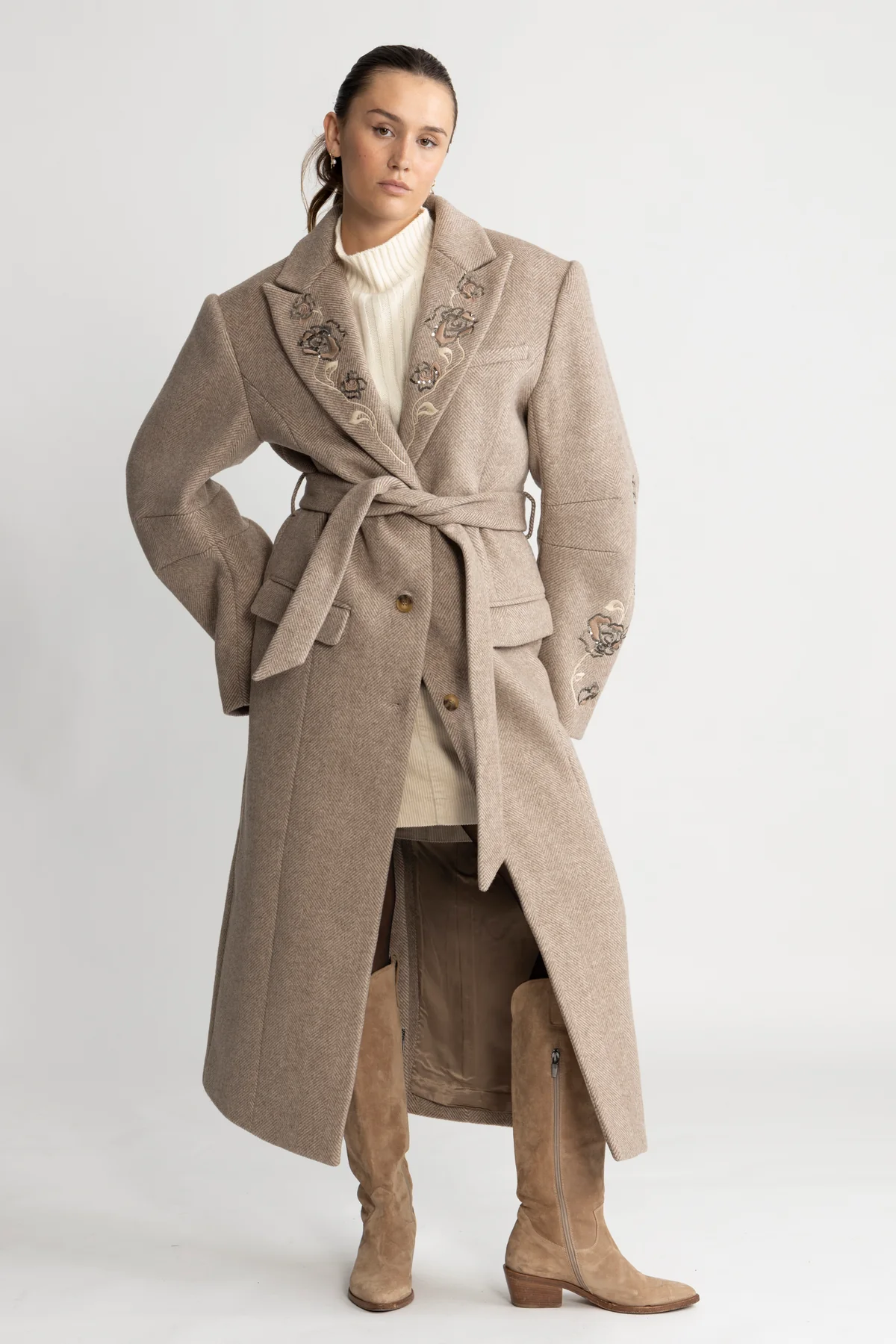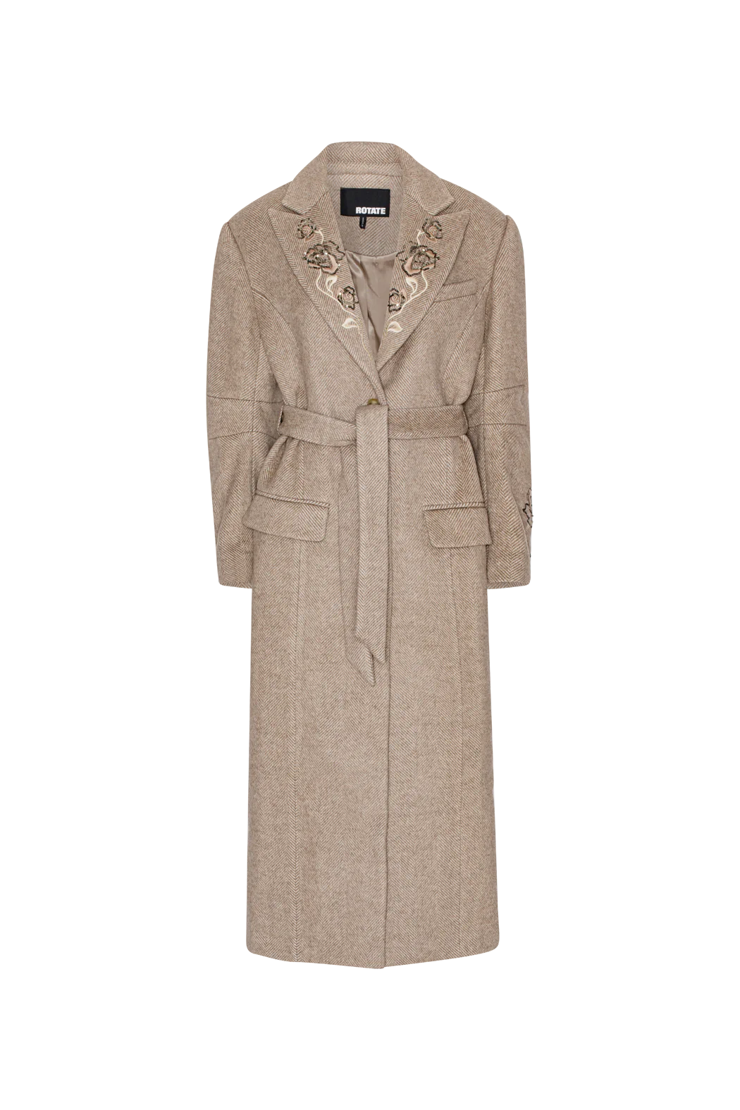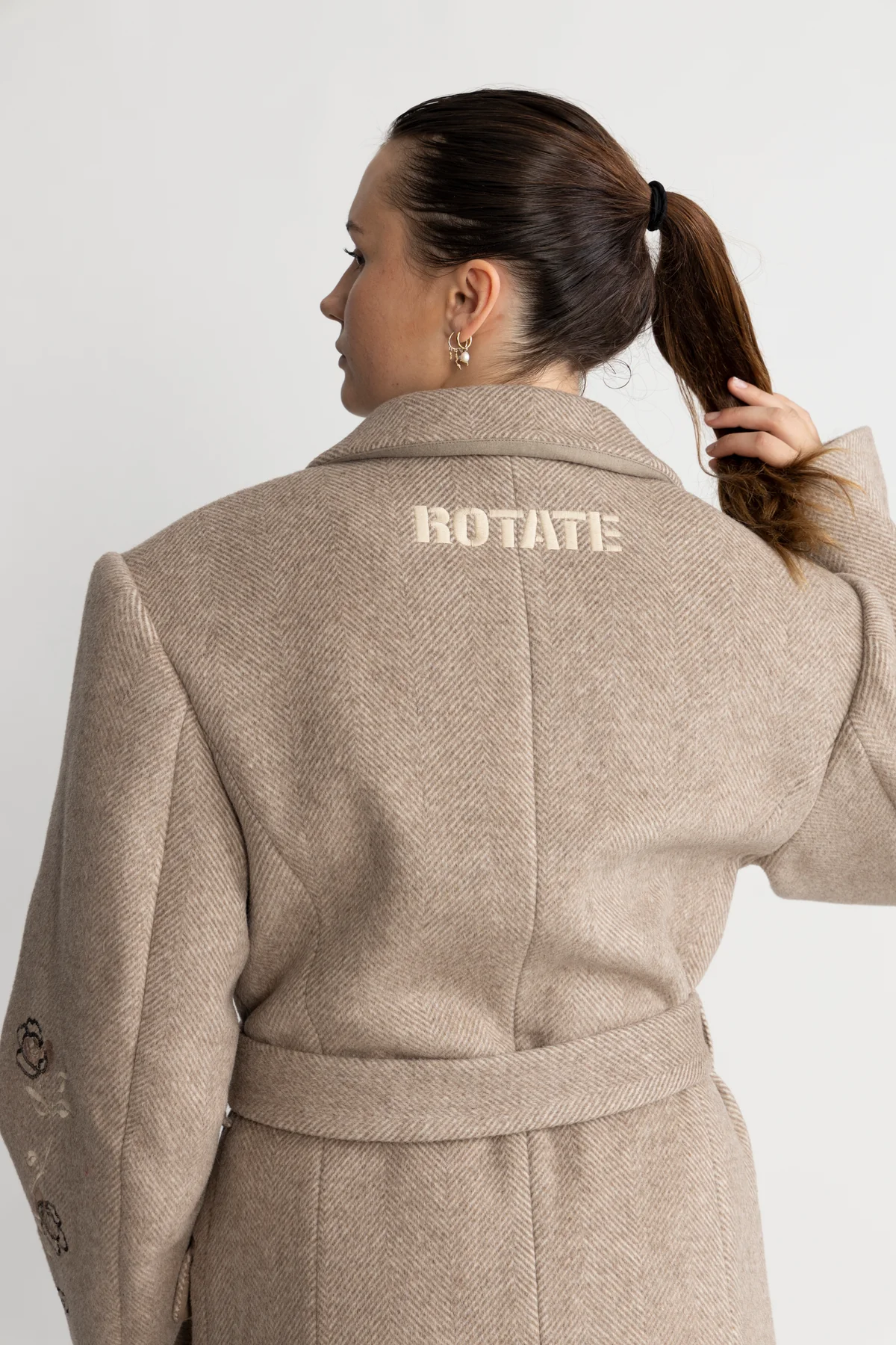 The Rotate Birger Christensen Belted Long Coat Taffy Camel is a must-have for cool days. Made from a lovely wool blend, it provides both warmth and elegance. The long silhouette and the matching belt create a sophisticated and flattering fit with a feminine touch. The delicate embroidery on the collar adds a luxurious feel, perfect for both casual and formal occasions. Wear this coat over your favorite outfit for a polished look that keeps you warm and trendy all season. Layer over denim such as the DL1961 Enora Cigarette cromer and a cosy jumper like the Rotate Birger Christensen Light Knit Logo Sweater Parchment