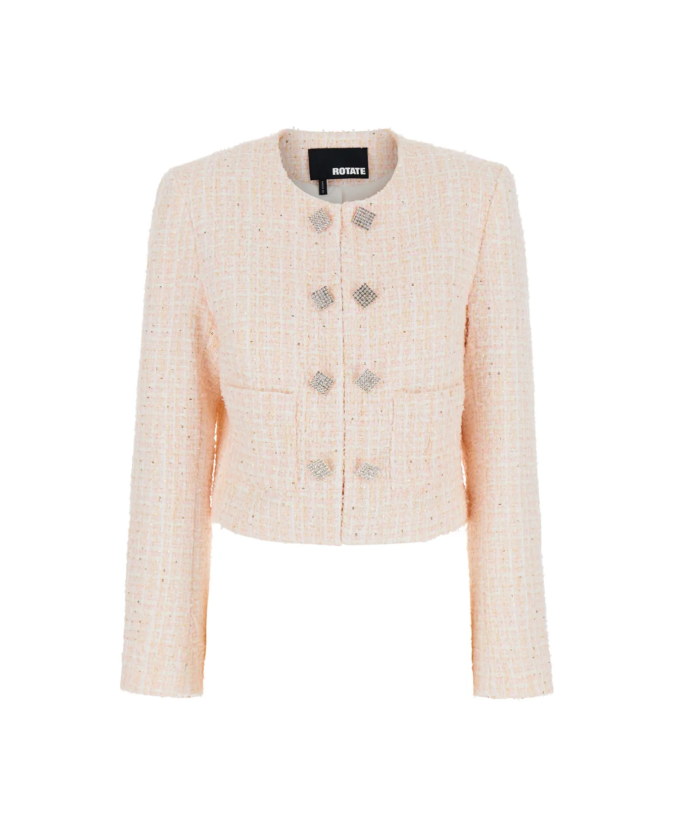The Rotate Birger Christensen Boucle Cropped Jacket Fairytale is a classic and elegant style in a gorgeous two tone pink and white boucle design. Featuring square diamante buttons down the front and on the cuffs and in a flattering cropped length, this classic jacket will take you day to night in style.