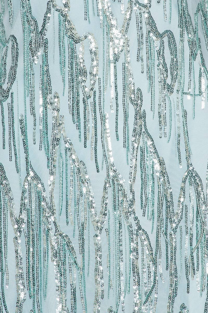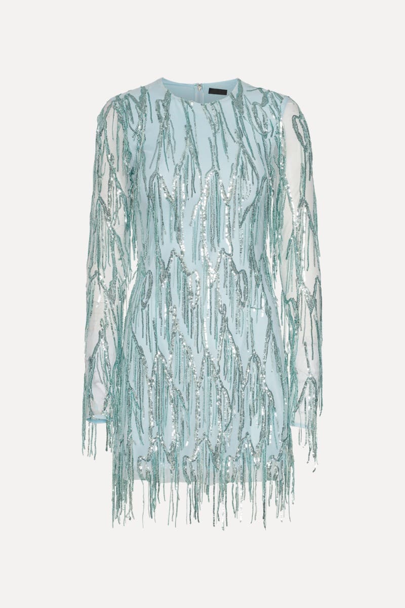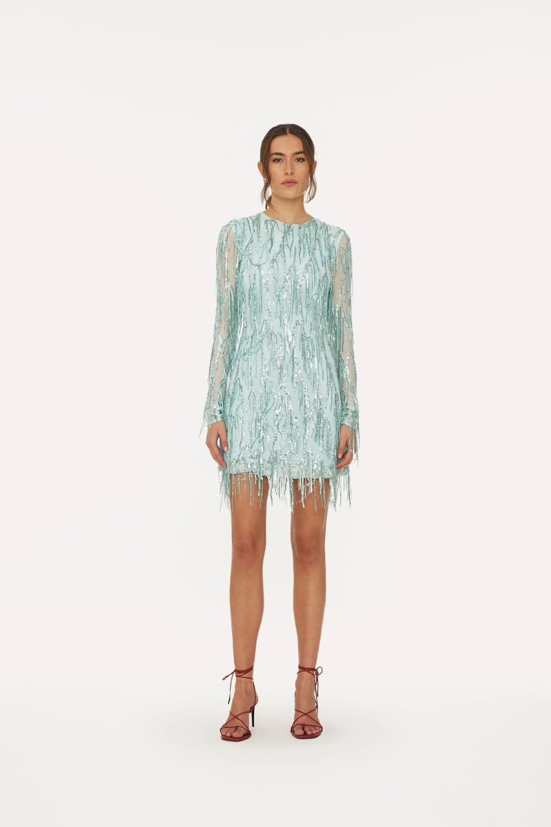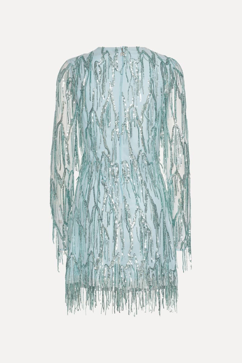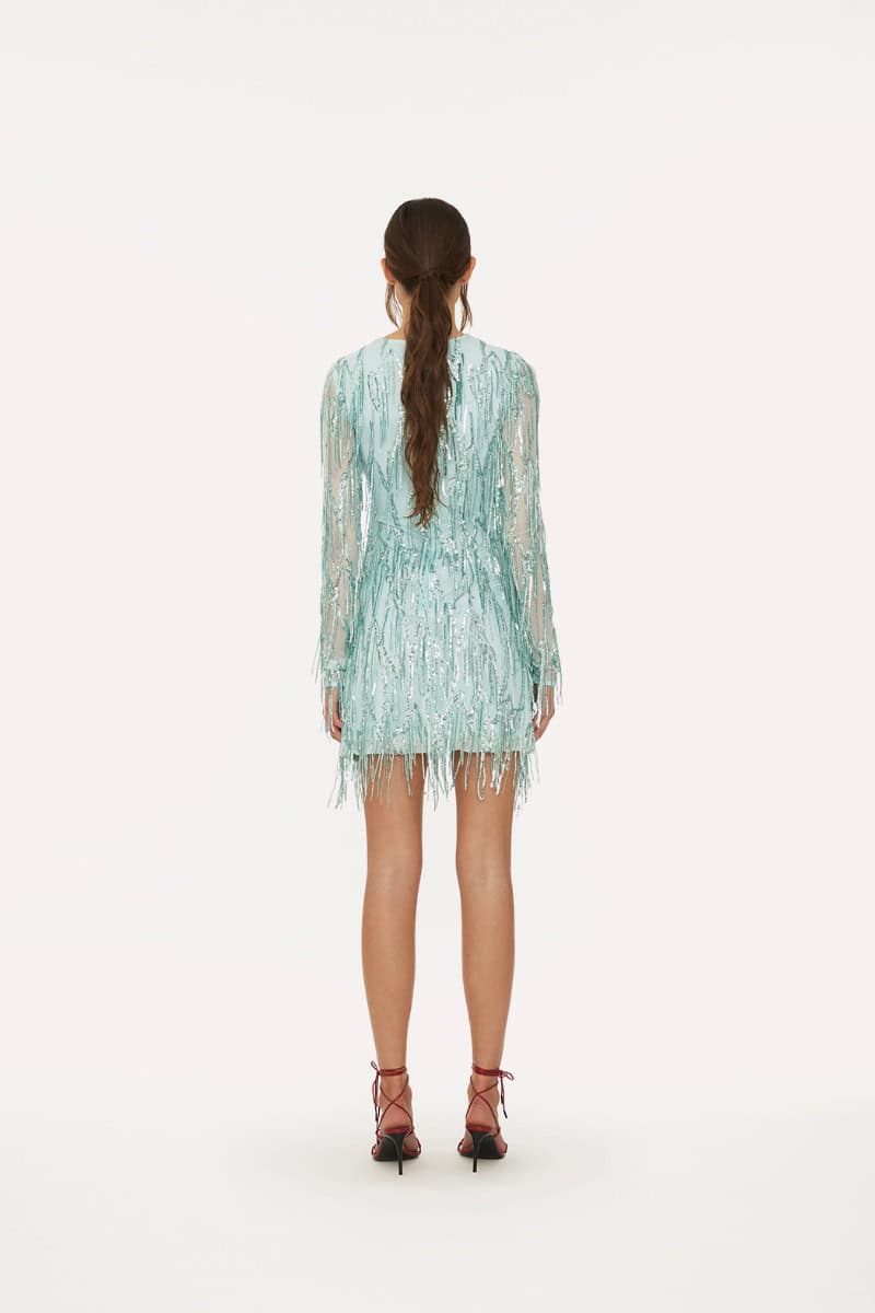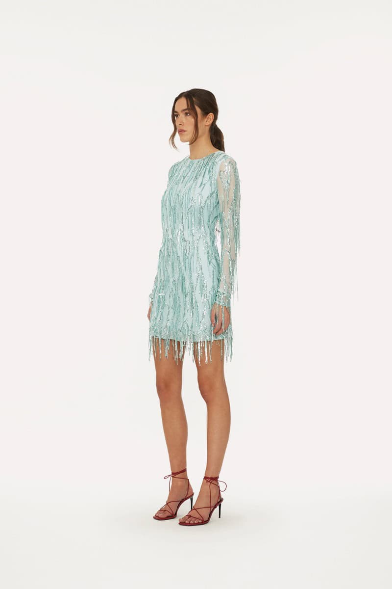 The Rotate Birger Christensen long sleeve mini dress in clearwater is a stunning fitted dress adorned with glamorous sequin fringes. It has a round neck and a straight fitted body with long sleeves and a zip fastening up the centre back. This dress is the perfect dress for any occasion and is guaranteed to make you stand out in a crowd.