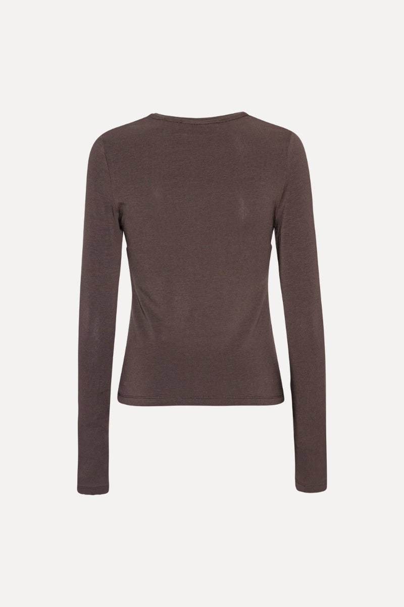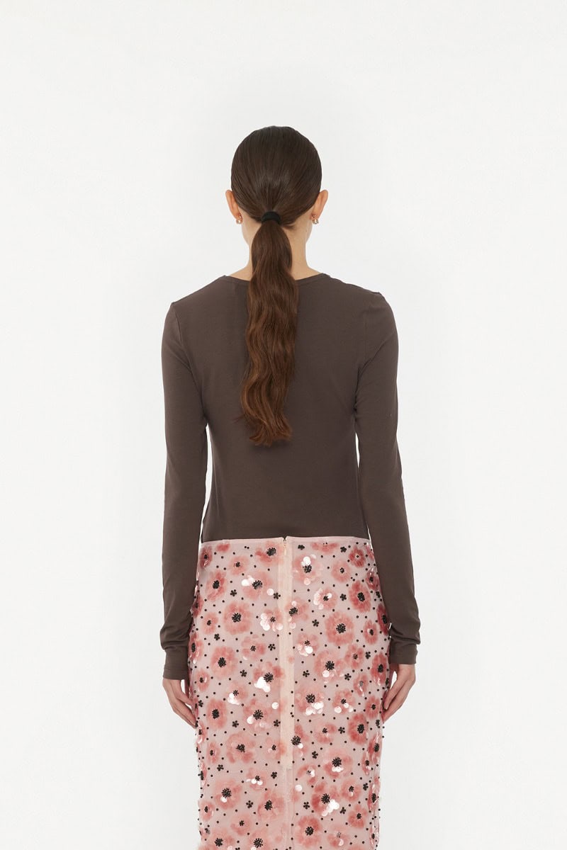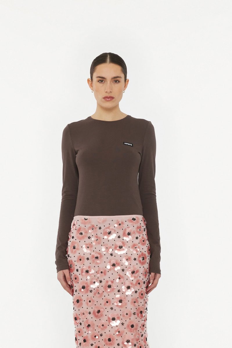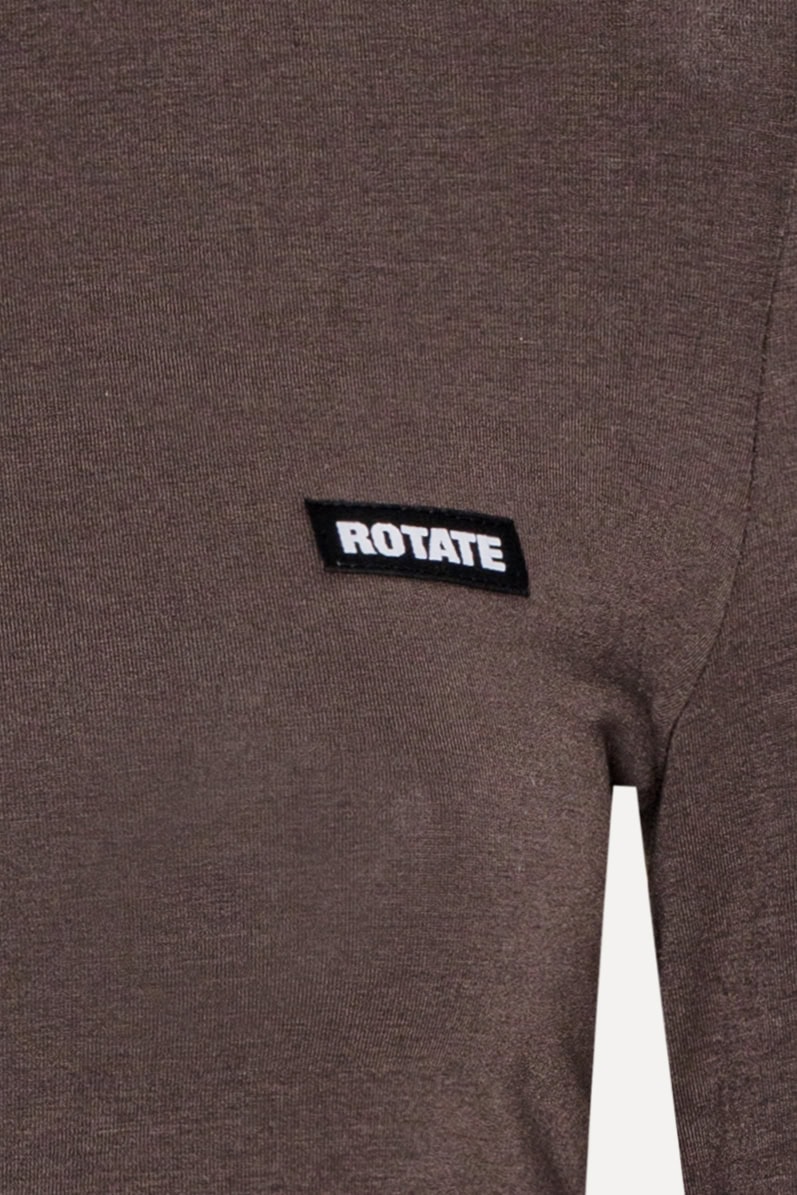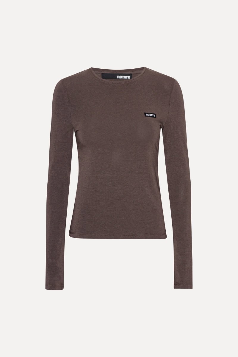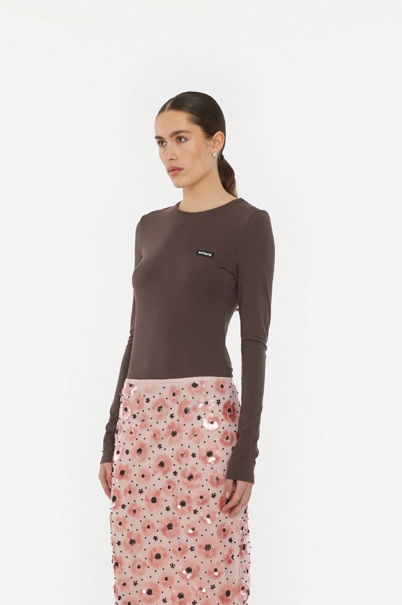 The Rotate Birger Christensen Long Sleeve T-Shirt Chocolate Brown, step out in style with our fitted logo patch top with long sleeves, featuring short sleeves for a casual yet chic look. Go for a casual look and pair with the DL1961 Enora Cigarette cromer or glam it up with the Rotate Birger Christensen Sequins Pencil Skirt Silver Pink