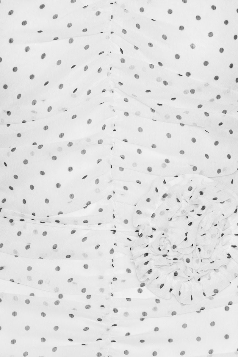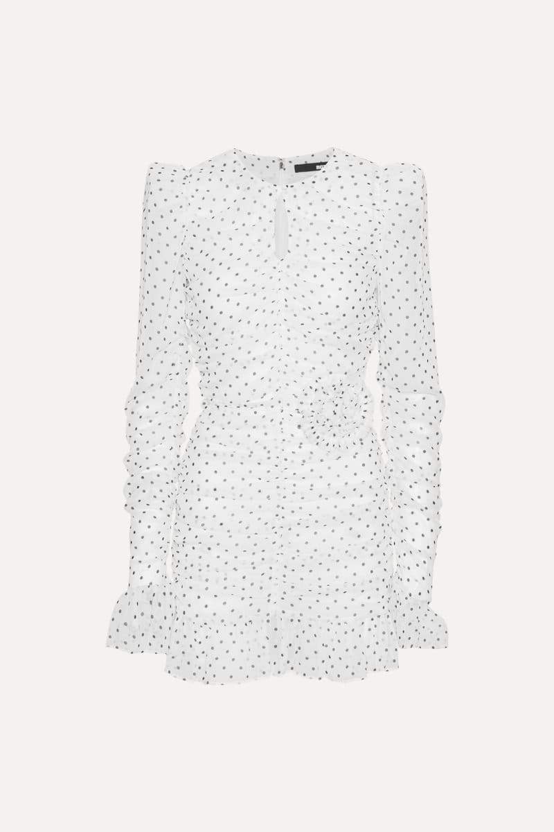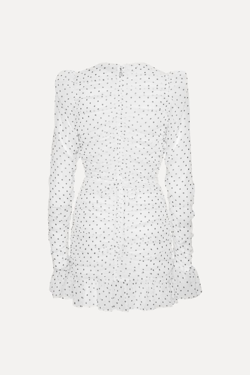 The Rotate Birger Christensen printed long sleeve mini dress in egret is the perfect dress to take you into summer. Featuring a ruched bodice and keyhole cutout at the front, this mini dress oozes style. The all over spot print, flared cuffs, ruffled hem and beautiful floral detailing at the waist ensures that this is a dress guaranteed to keep you in the spotlight.