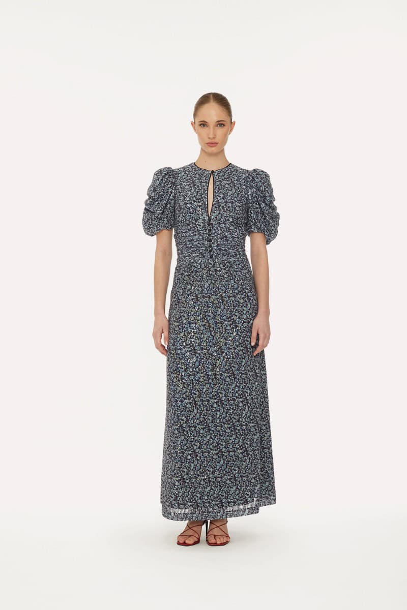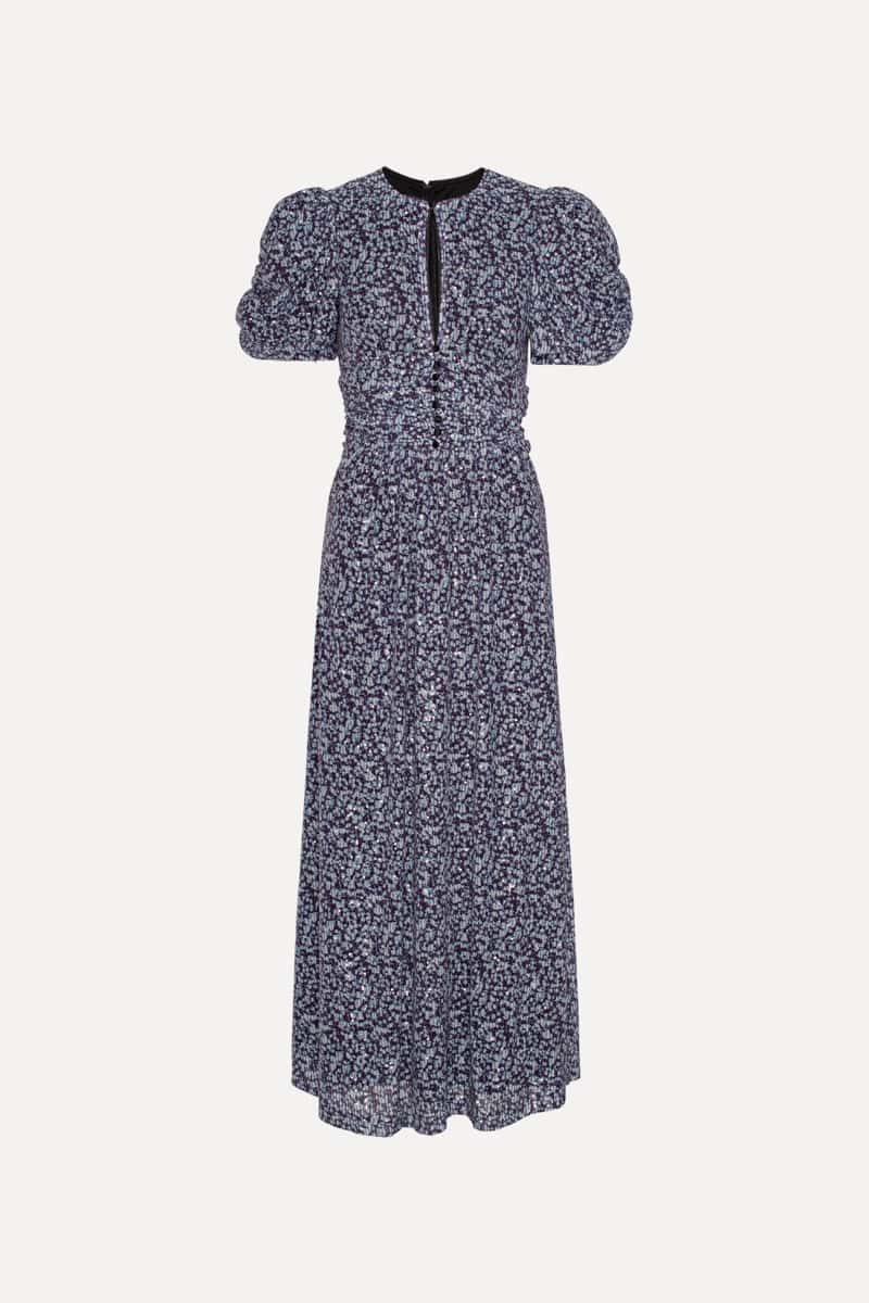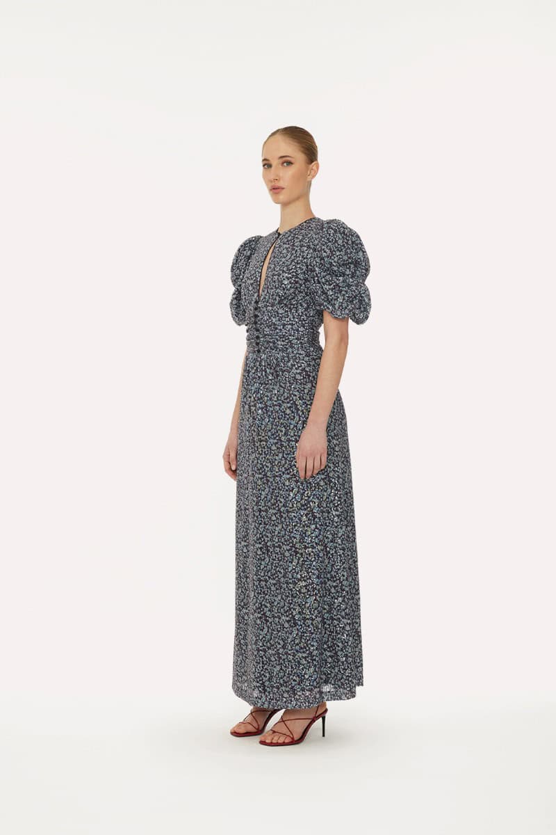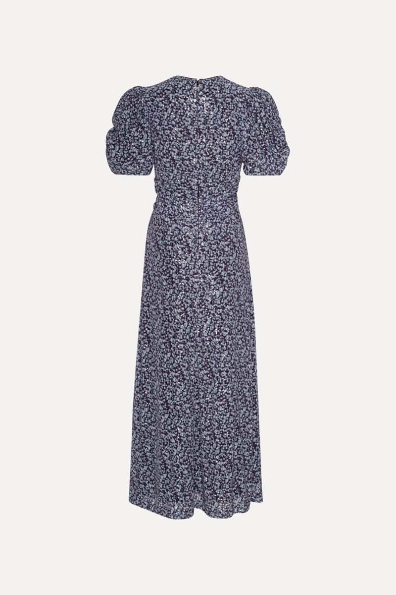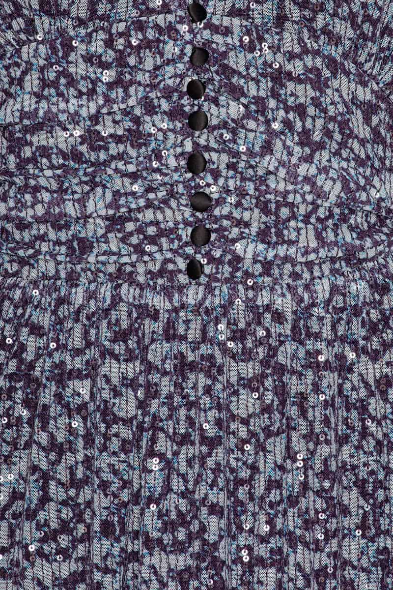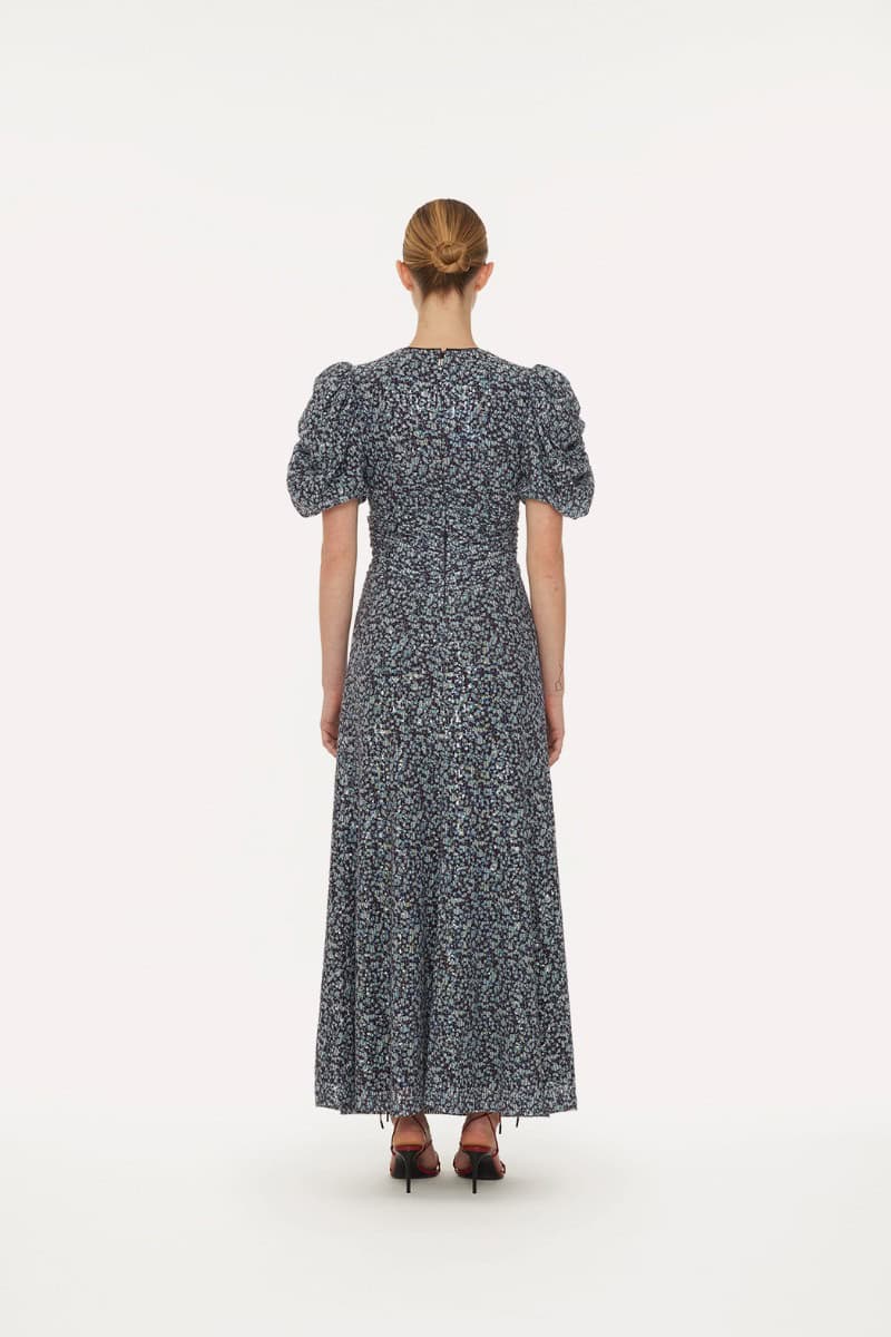 The Rotate Birger Christensen puff sleeve sequin dress in vibrant floral and purple pennant is the perfect combination of elegance and modern flair. The dress has a ruched waistband that is complemented by a vertical row of buttons and is adorned with small clear sequins. The skirt falls beautifully at a midi length and the ruched puff sleeves add a little bit of drama to the perfect fusion of style and sophistication.