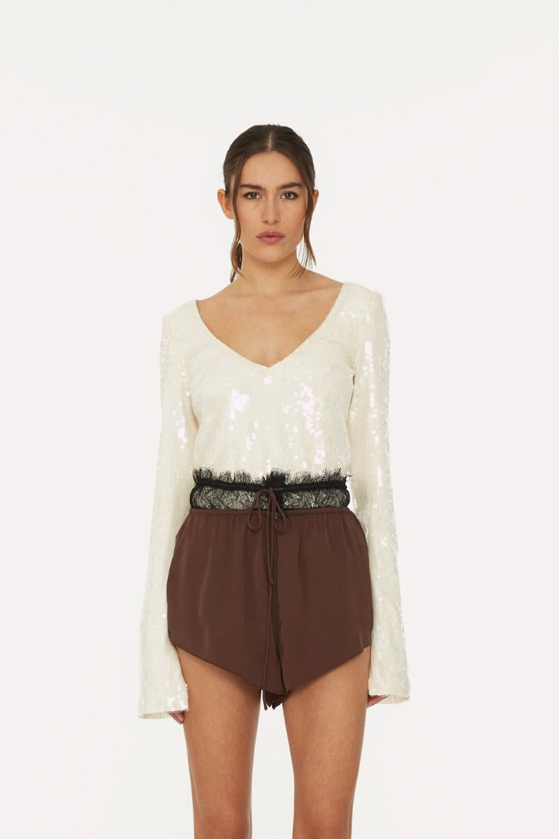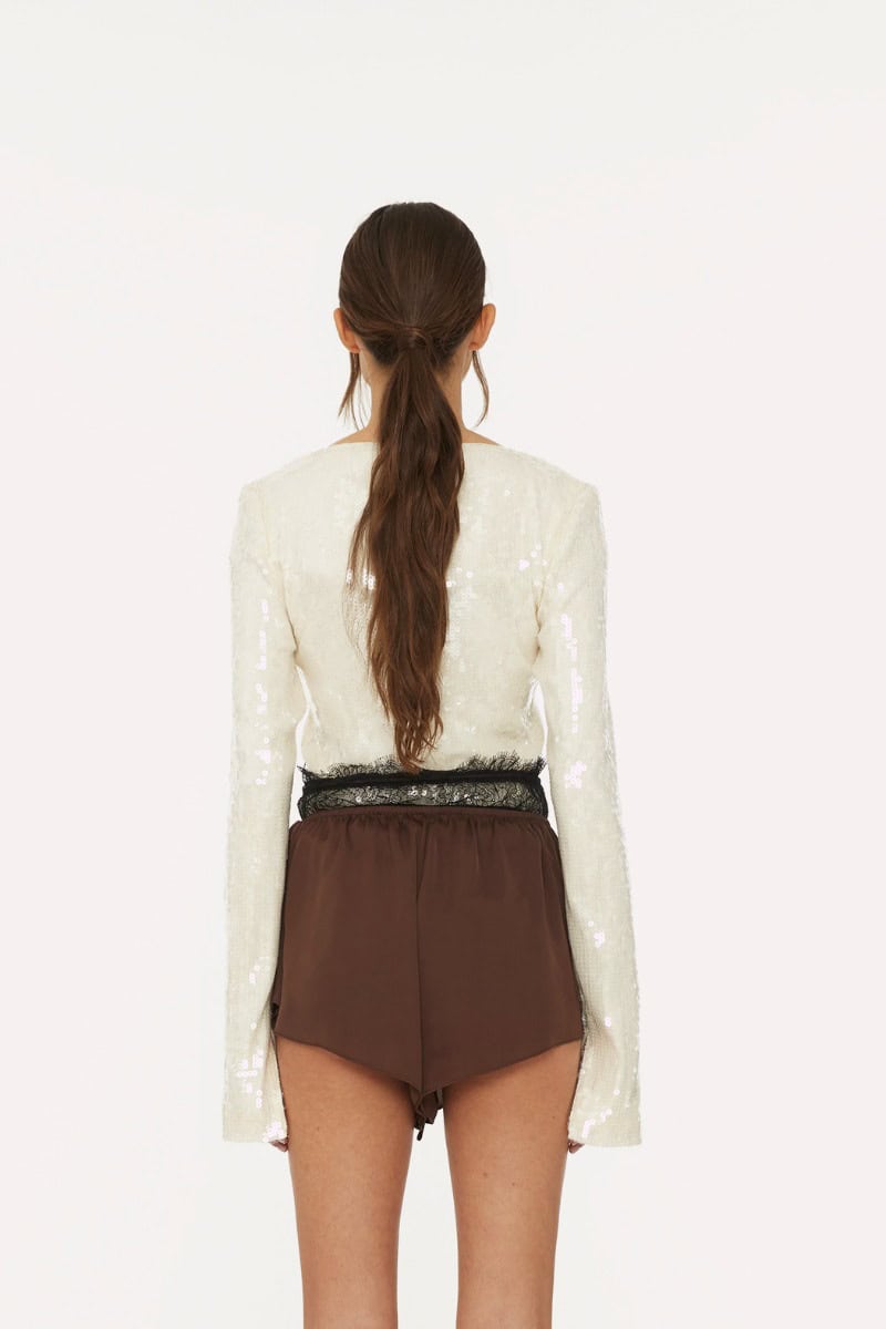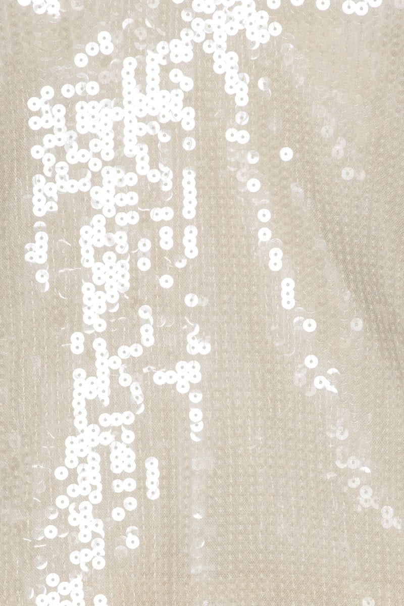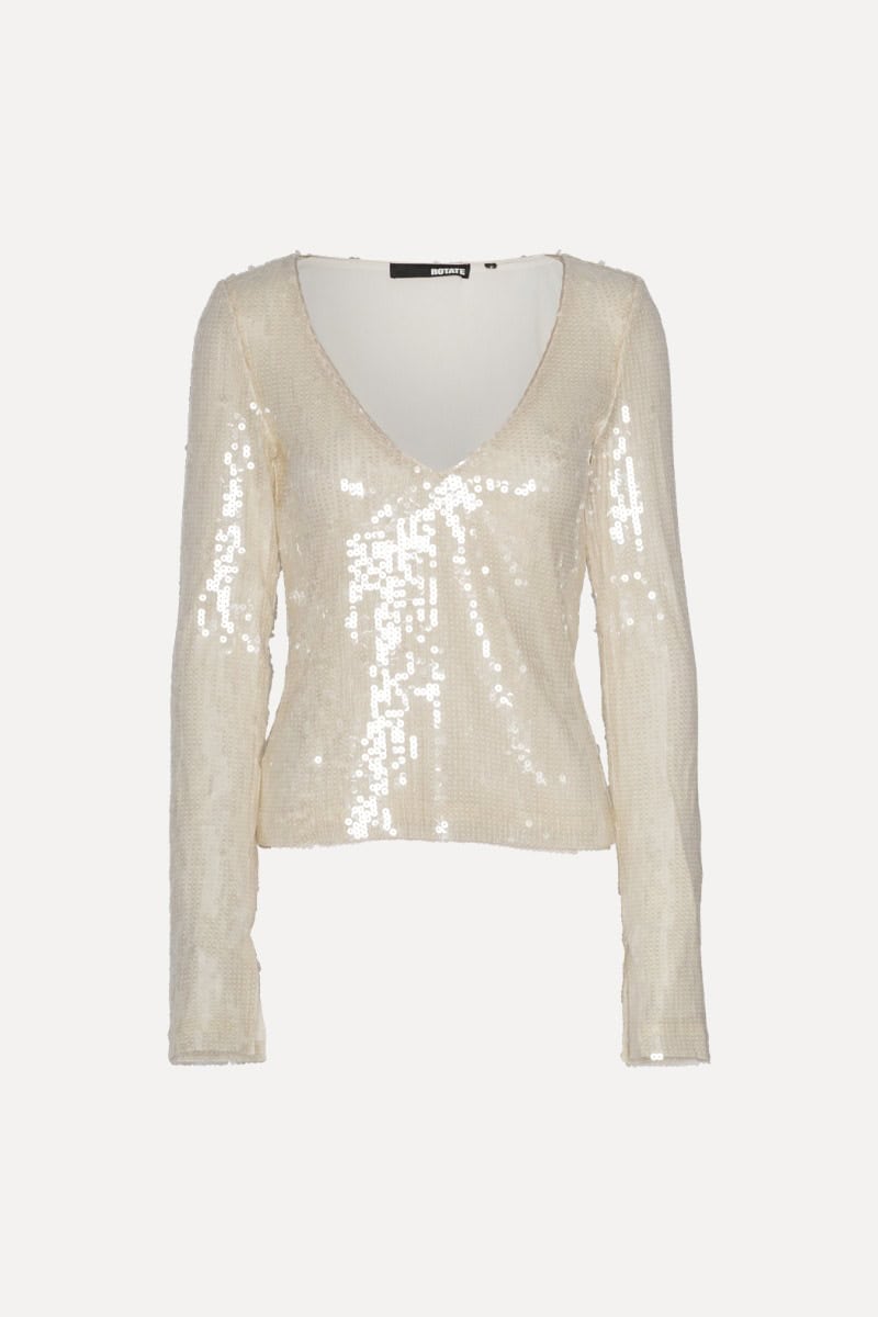 This Rotate Birger Christensen sequin v neck top in ecru is the perfect addition to any wardrobe. With its sultry deep v-neck and chic slits at the cuffs of the long sleeves, it is guaranteed to grab attention. The flattering silhouette ensures the perfect fit. Style with mini skirts or denim for a stylish look.