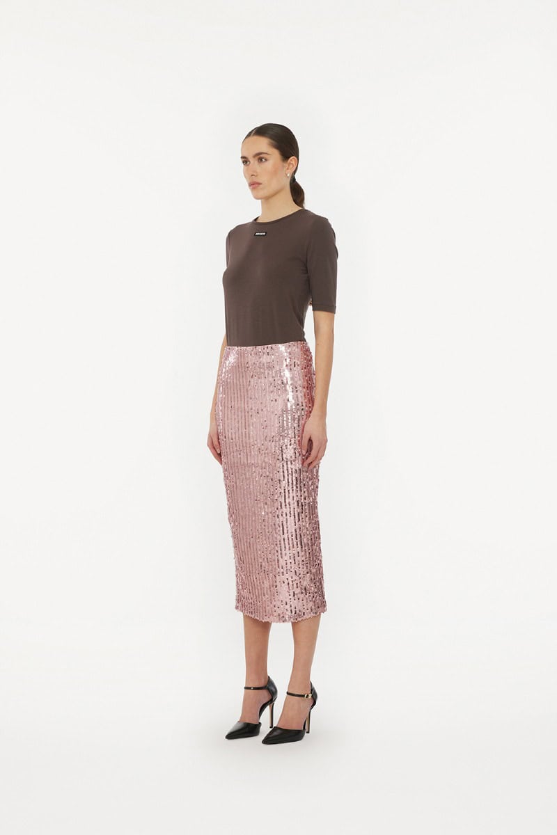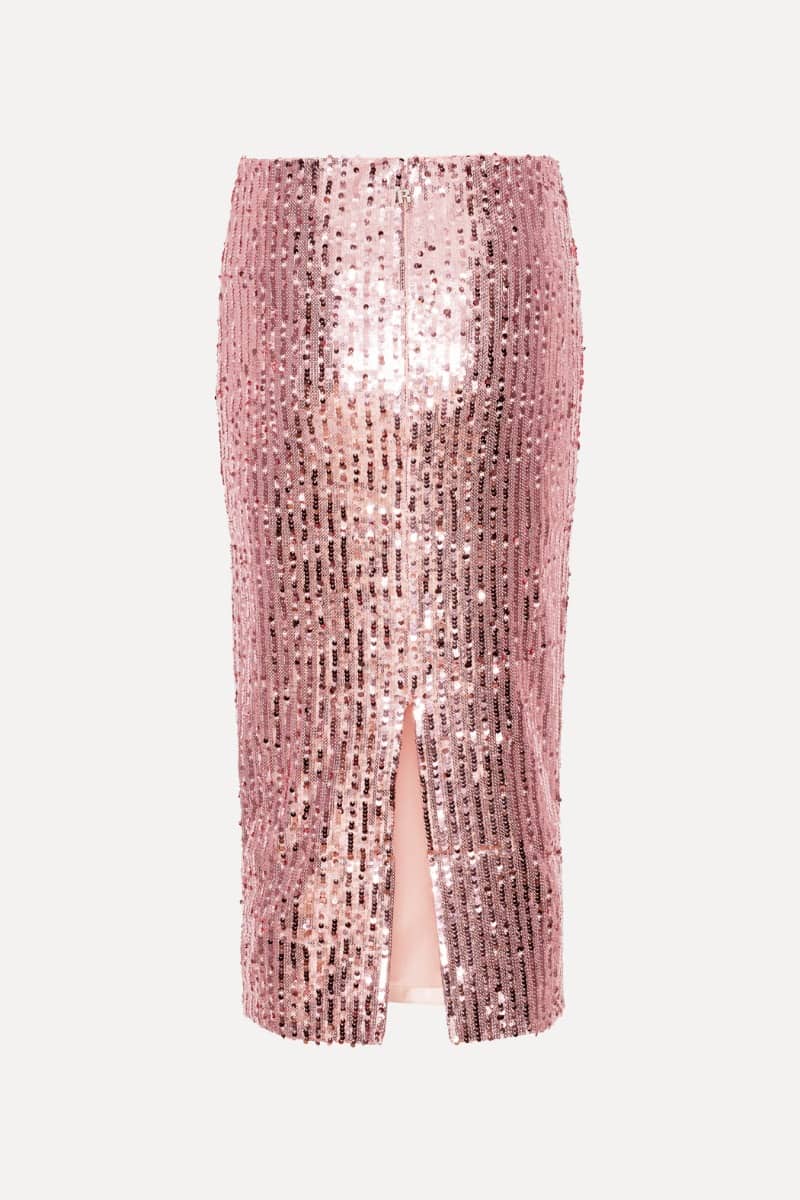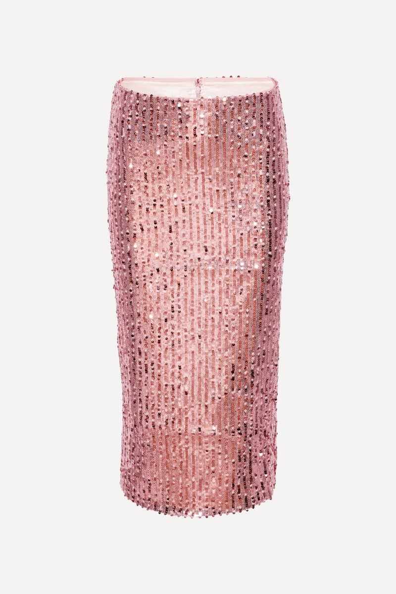 The Rotate Birger Christensen Sequins Pencil Skirt Silver Pink is a fitted silhouette crafted with shimmering sequins. this high-waisted skirt falls to mid-calf and features a back slit for ease of movement. a concealed zip with an "r" logo puller ensures a sleek finish. fully lined for comfort. Pair yours with a cosy knit cardigan such as the Second Female Roy Cardigan Grey Melange