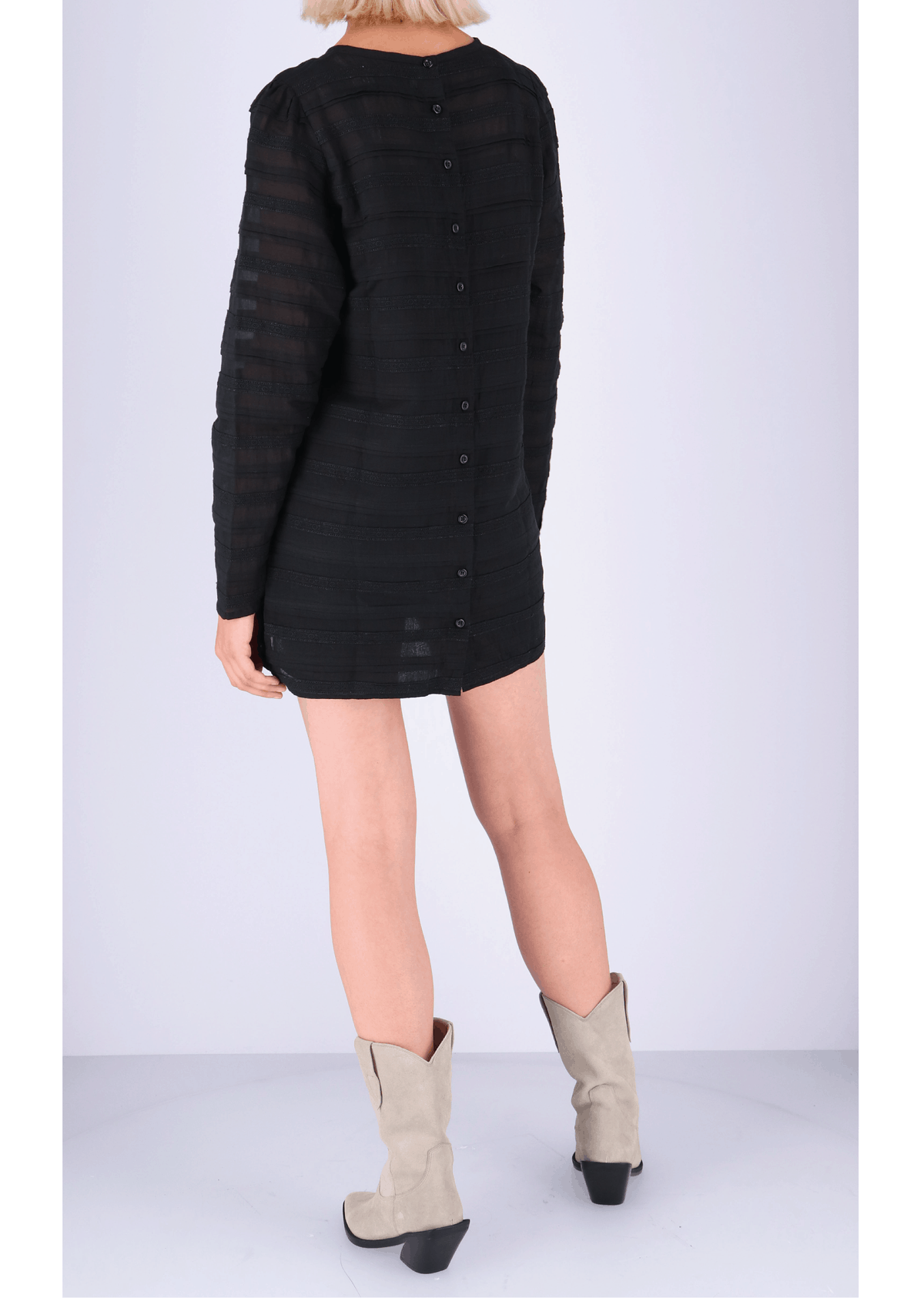 The Rough Studios Mya dress in black is the perfect companion for lazy summer days and evenings. The dress is made from a semi sheer cotton voile with a relaxed fit and pleats throughout the dress, just team with sandals for easy summer outfit. Those less daring by need to put a slip underneath.