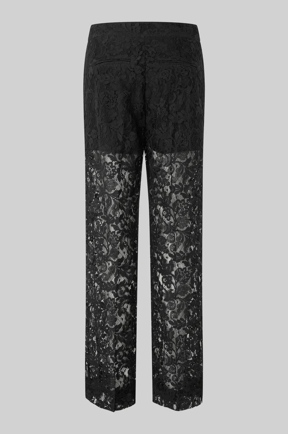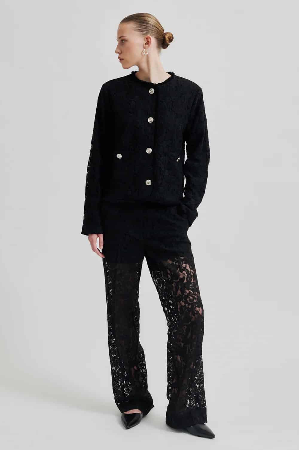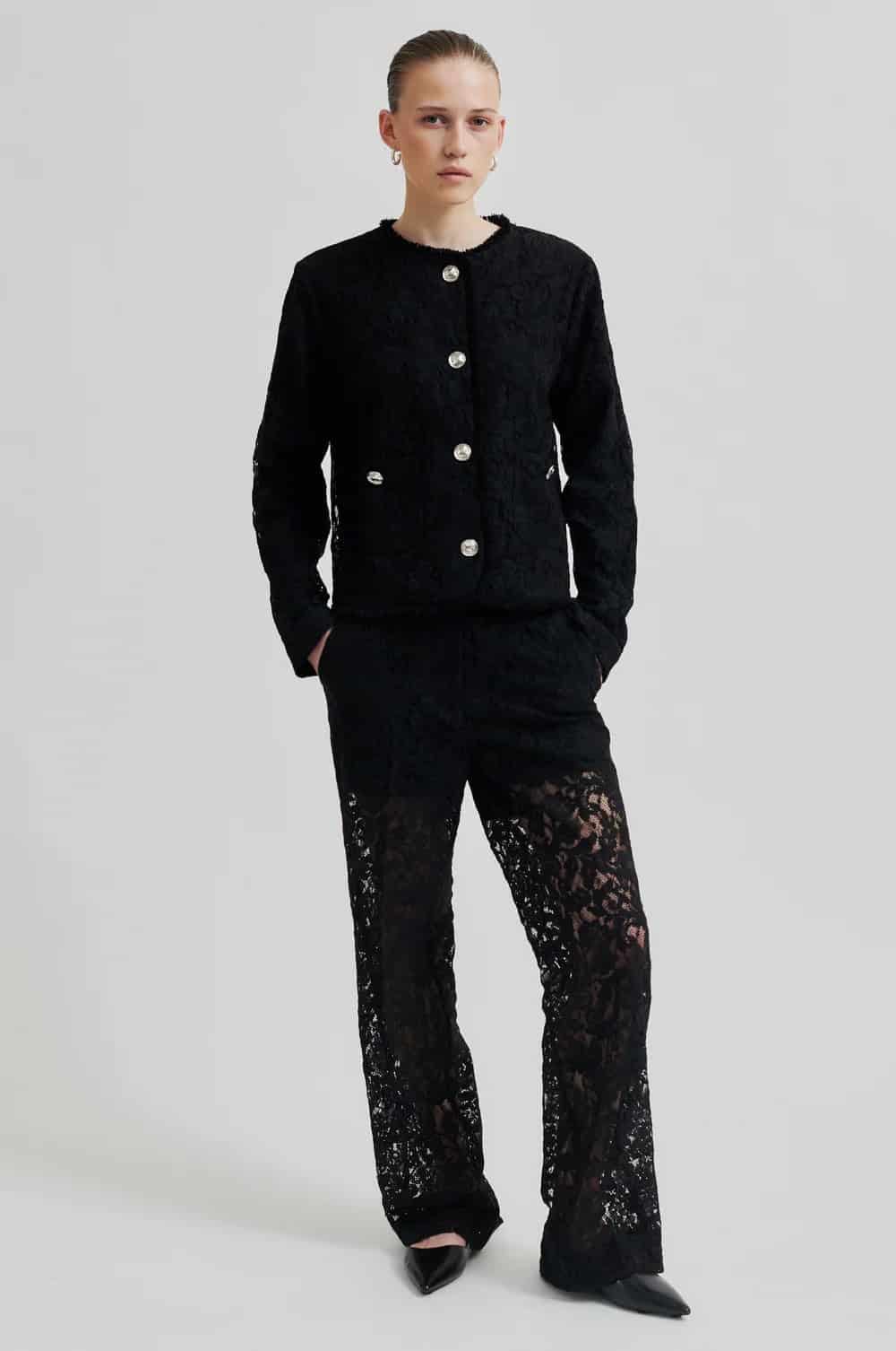 The Second Female border trousers in black are a stunning pair of floral lace, straight leg trousers that are lined with shorts and have unlined legs. Featuring a concealed zip, hook and button fastening as well as two slanted pockets at the front, these trousers are perfect for wearing in the evening when teamed with a camisole or blouse and a blazer and then dressed down for a more casual look with a chunky knit such as Second Female Brookline Knit O Neck Mulch