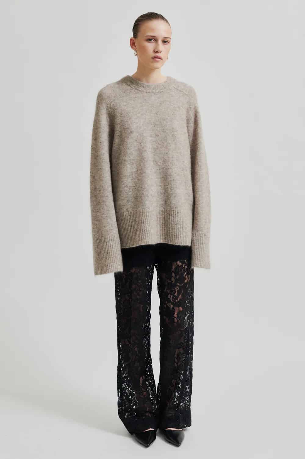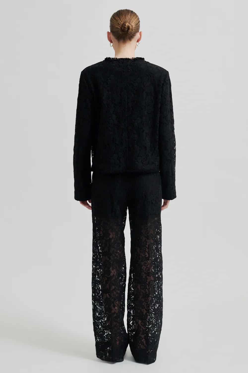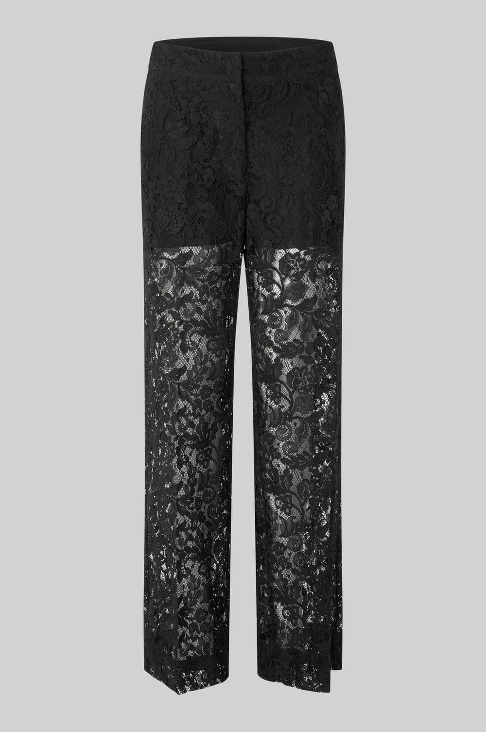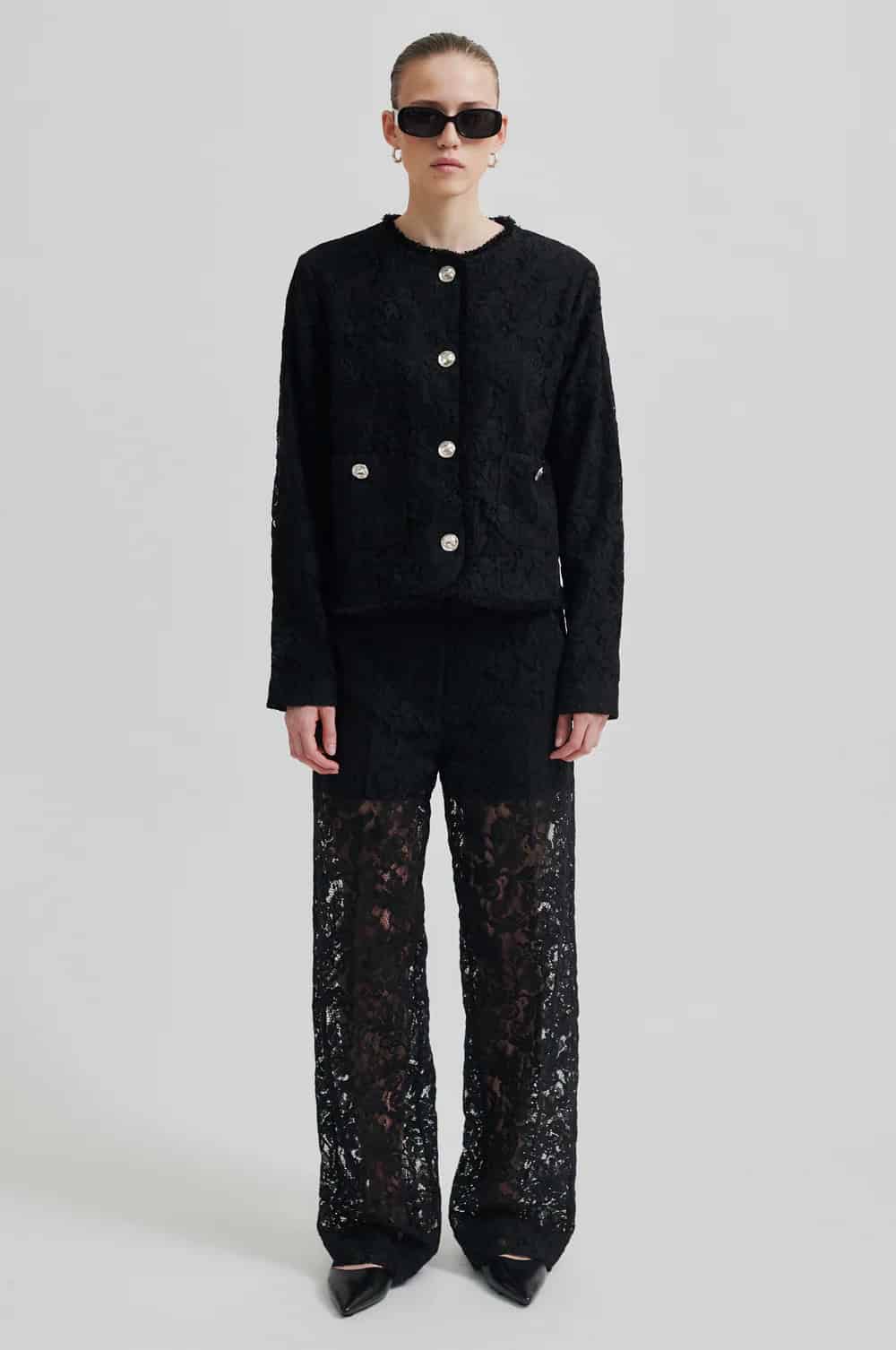 The Second Female border trousers in black are a stunning pair of floral lace, straight leg trousers that are lined with shorts and have unlined legs. Featuring a concealed zip, hook and button fastening as well as two slanted pockets at the front, these trousers are perfect for wearing in the evening when teamed with a camisole or blouse and a blazer and then dressed down for a more casual look with a chunky knit such as Second Female Brookline Knit O Neck Mulch