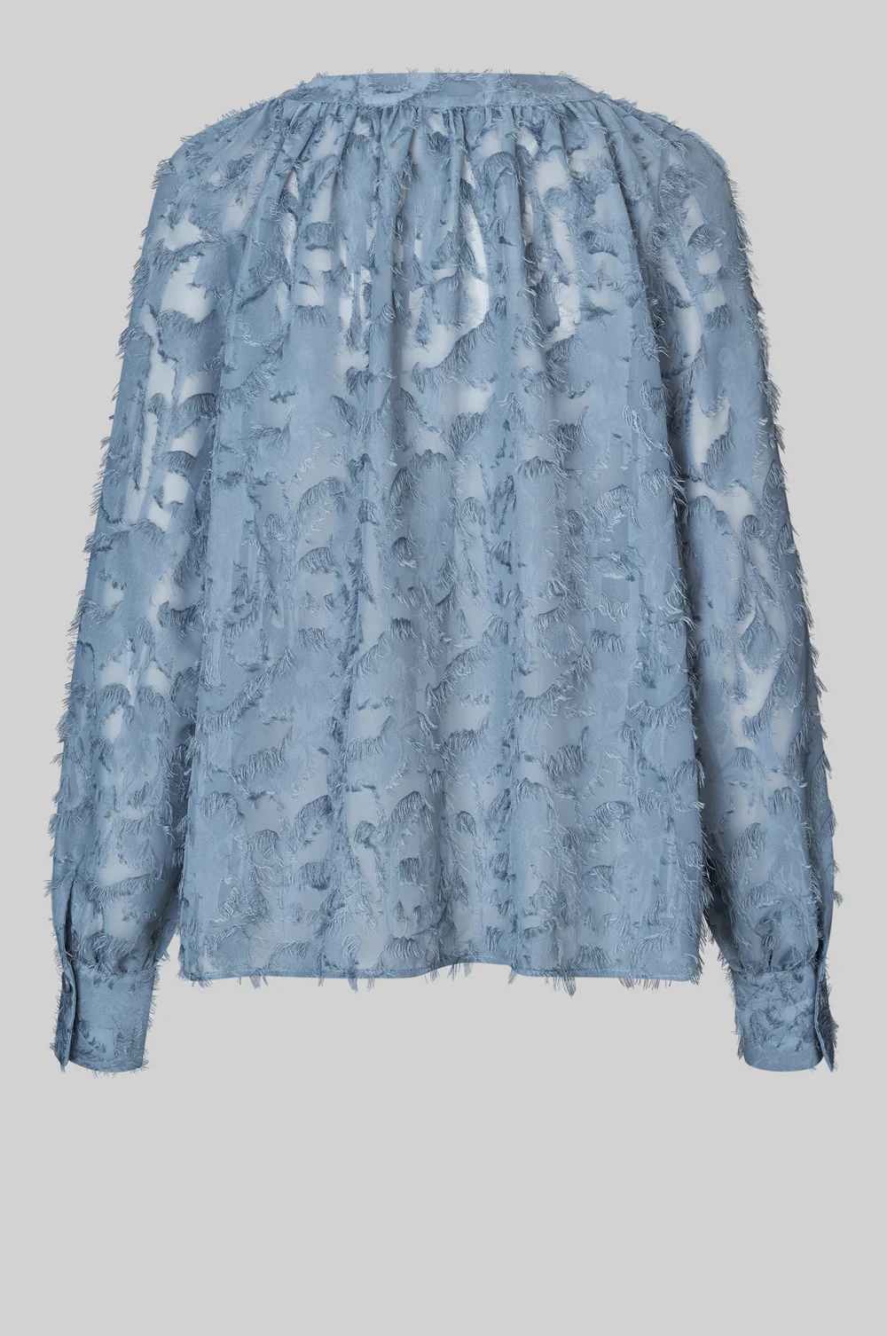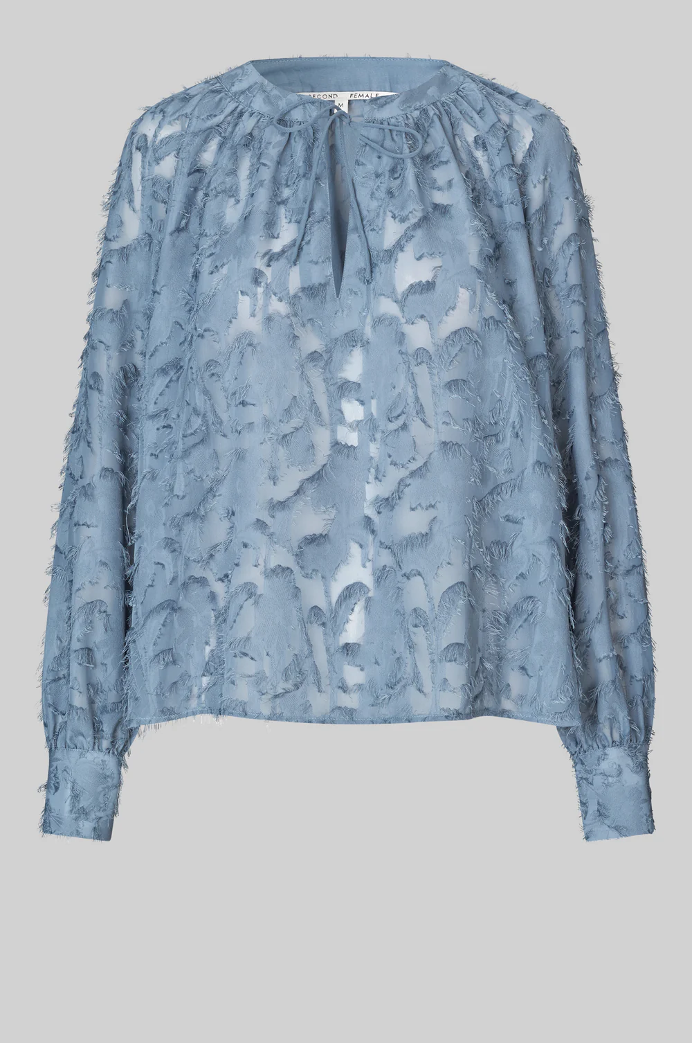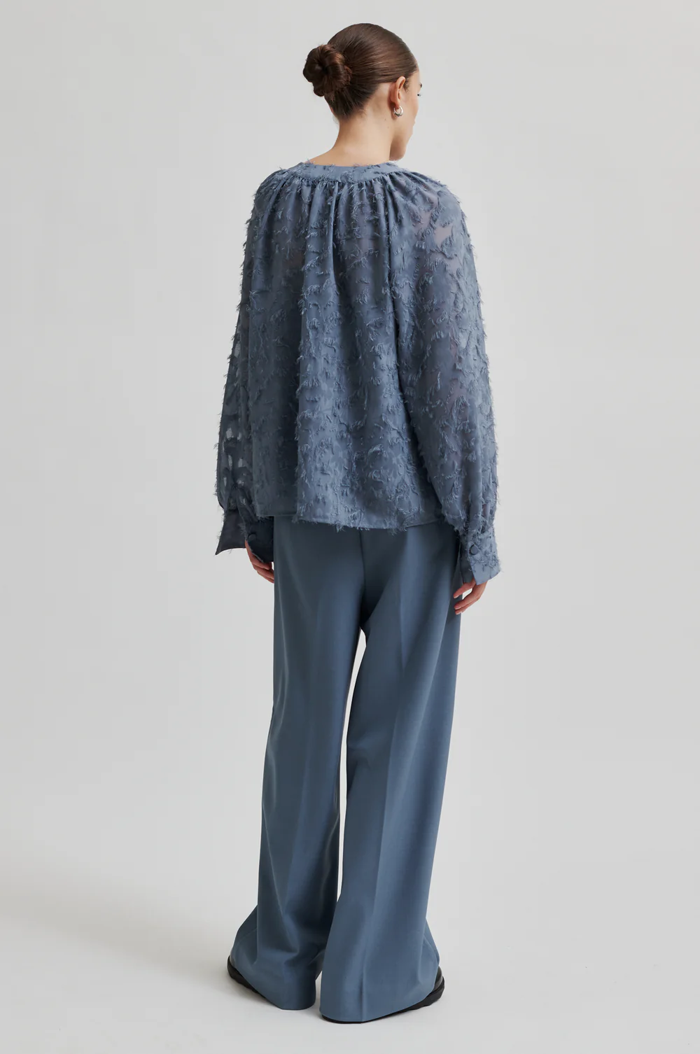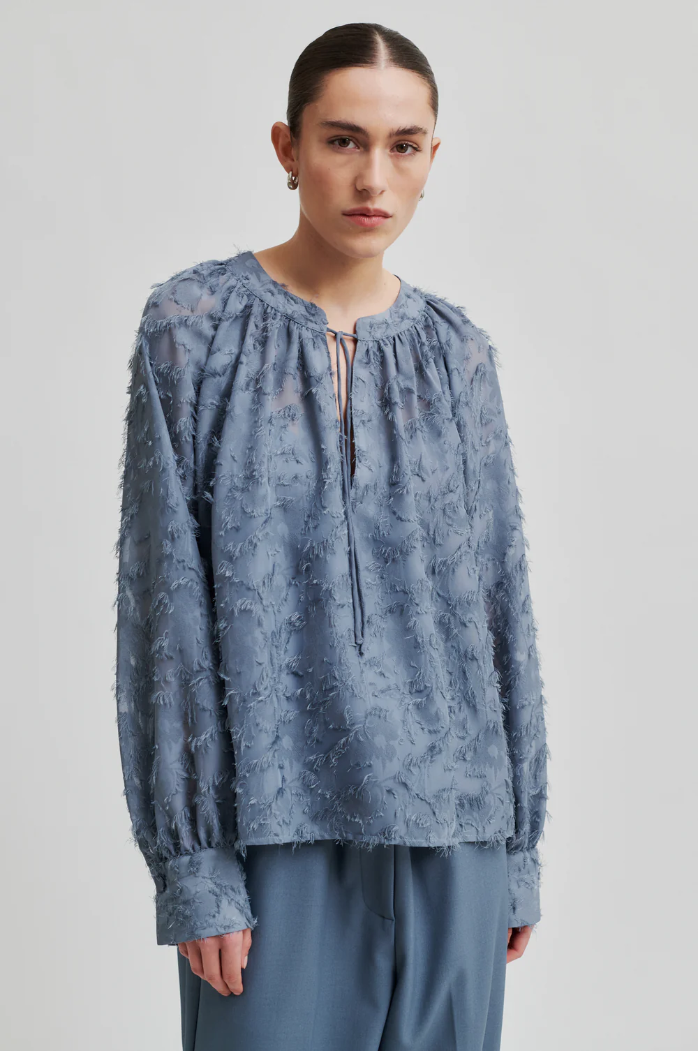 The Second Female Carey Blouse Flint Stone is a beautiful textured blouse. Made in light, semi-sheer fabric with textured 3D pattern. Separate slip in tonal colour with thin adjustable straps. Featuring a small stand-up collar and open neckline with tie fastening. Tiny gathers all around neck to create extra volume. Raglan sleeves with shirt cuffs with button fastening. Loose, fluid silhouette.