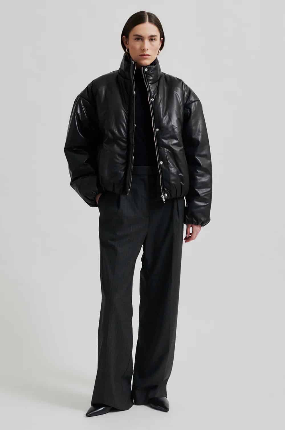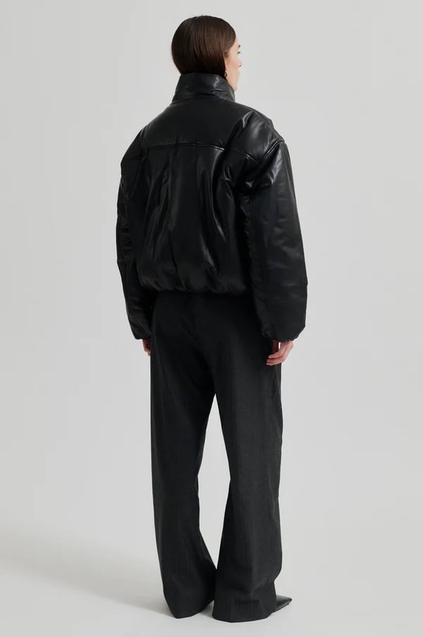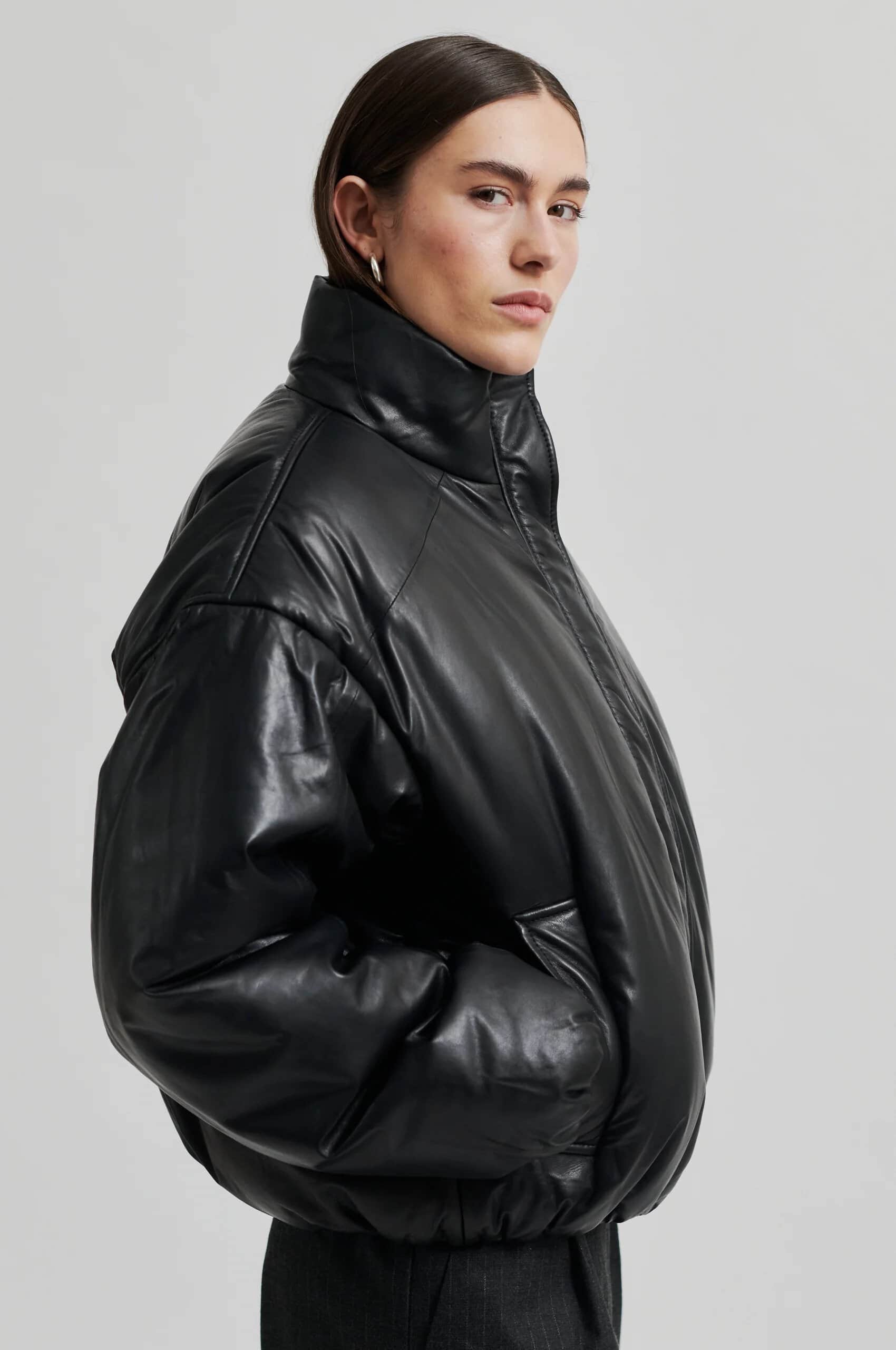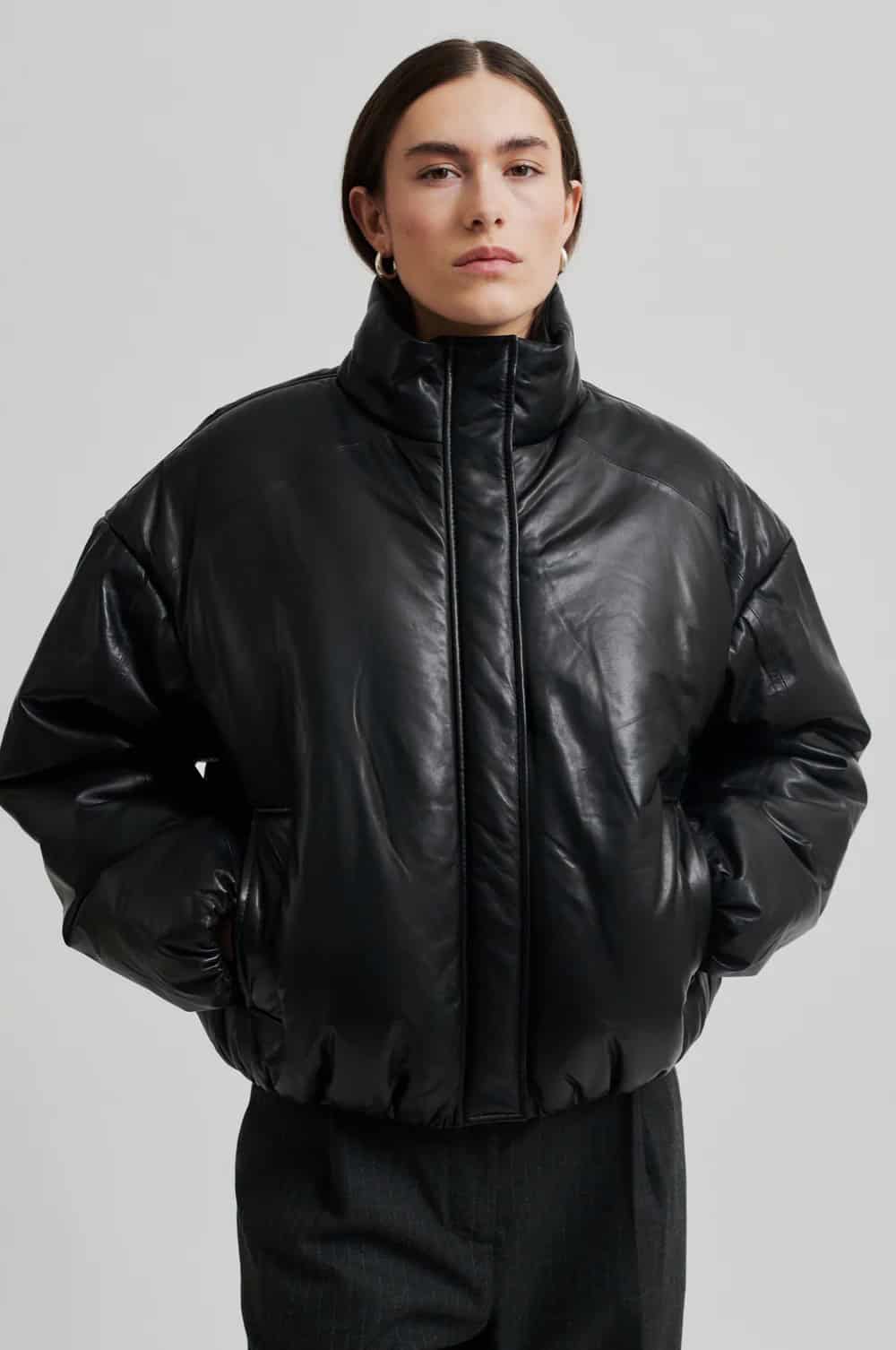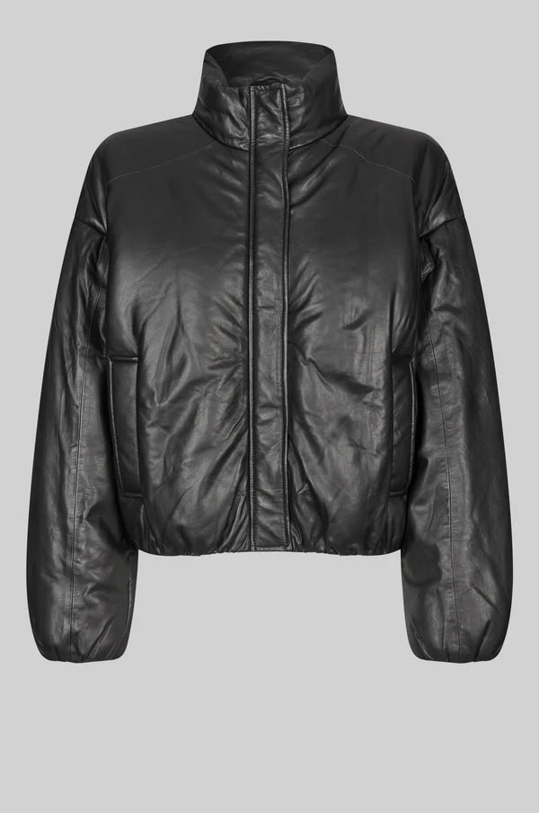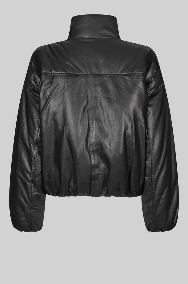 The Second Female Harlow leather bomber jacket in black is a seriously stunning and super soft, shiny leather jacket with a lightly padded interior and a relaxed fit. Featuring dropped shoulders, a high neck and placket with concealed zip and press studs at the front and an elasticated leather rib at cuffs and bottom hem, this jacket is the staple you never knew you needed. Style it with your favourite relaxed trousers for an elevated day look or give an evening look a bit of edge by wearing it styled over a feminine dress.
