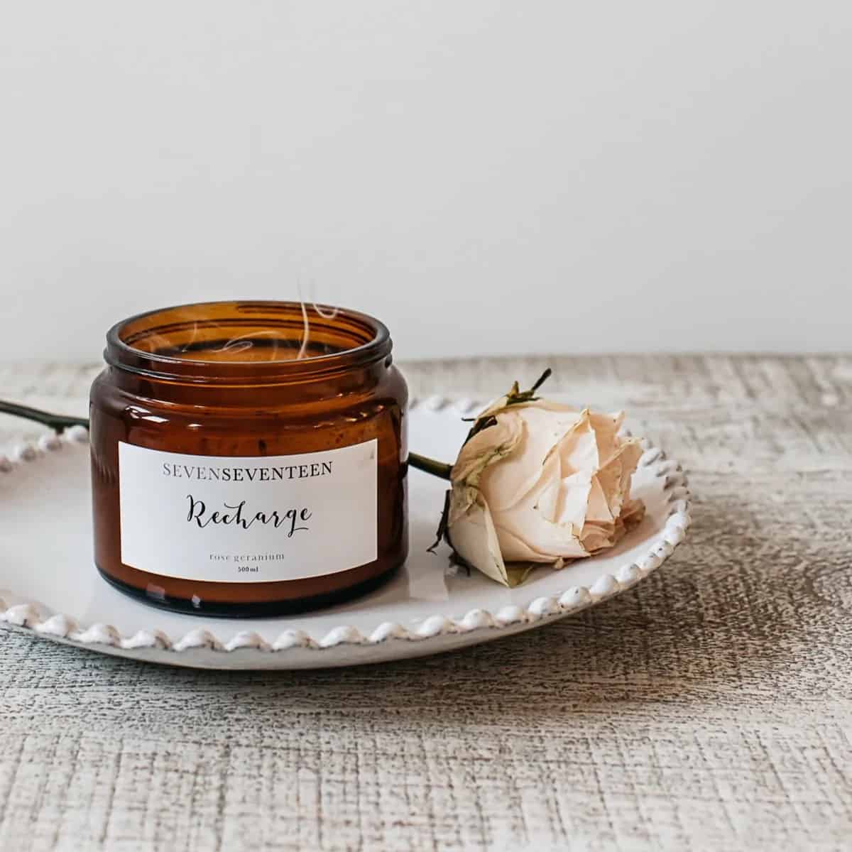 If only we recharged ourselves as often as our phones. Well, now you can thanks to our restorative rose geranium essential oil candle.