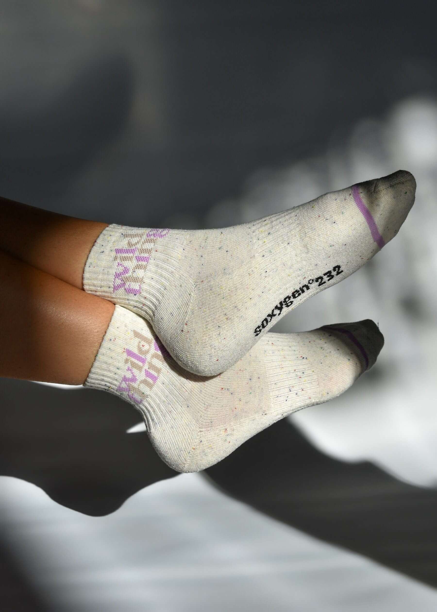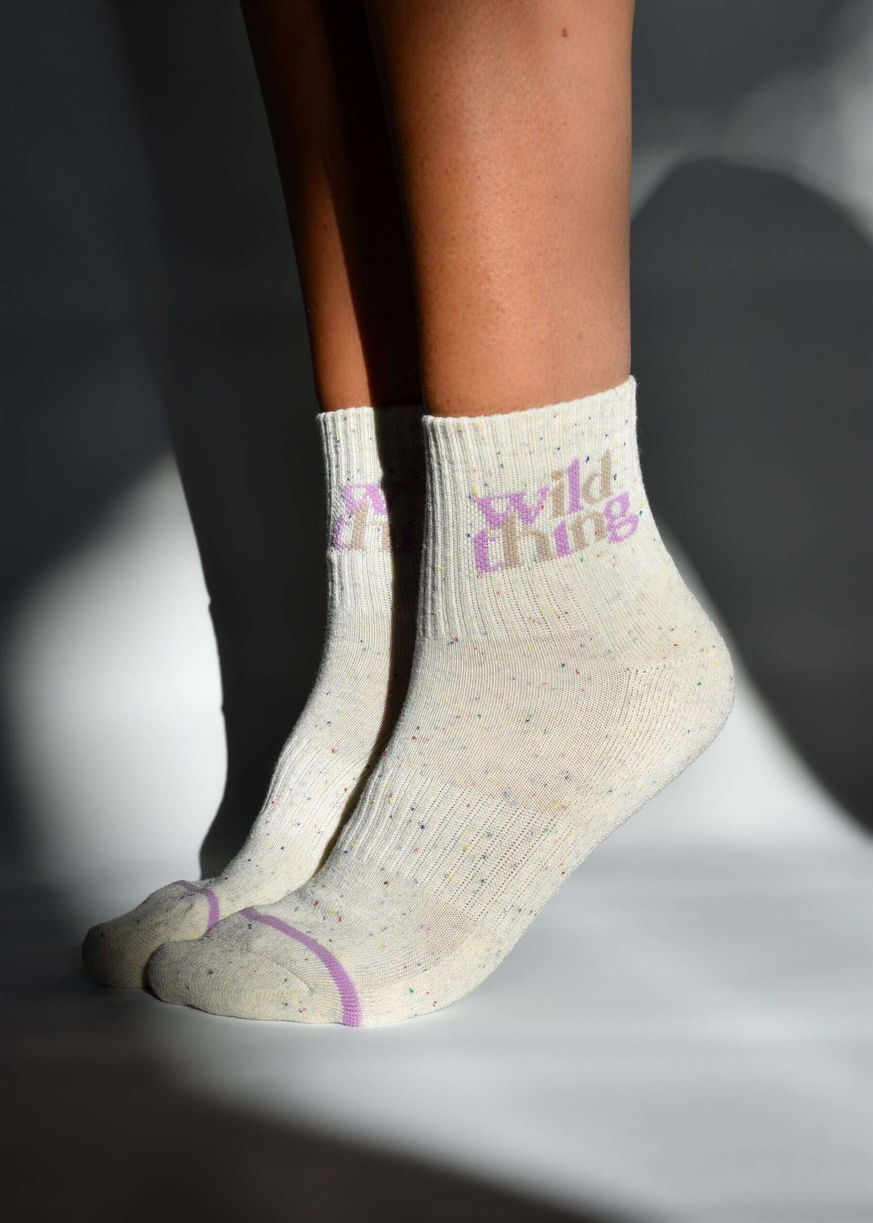 The Soxygen Wild Thing Mini Crew Sock in Fleck is the perfect ribbed sock for wearing over your leggings or just day to day to put a smile on your face and add some humour and sarcasm to your daily outfit. On a ecru cotton base it features purple and taupe lettering on the side, black lettering on the sole and a fleck appearance.
