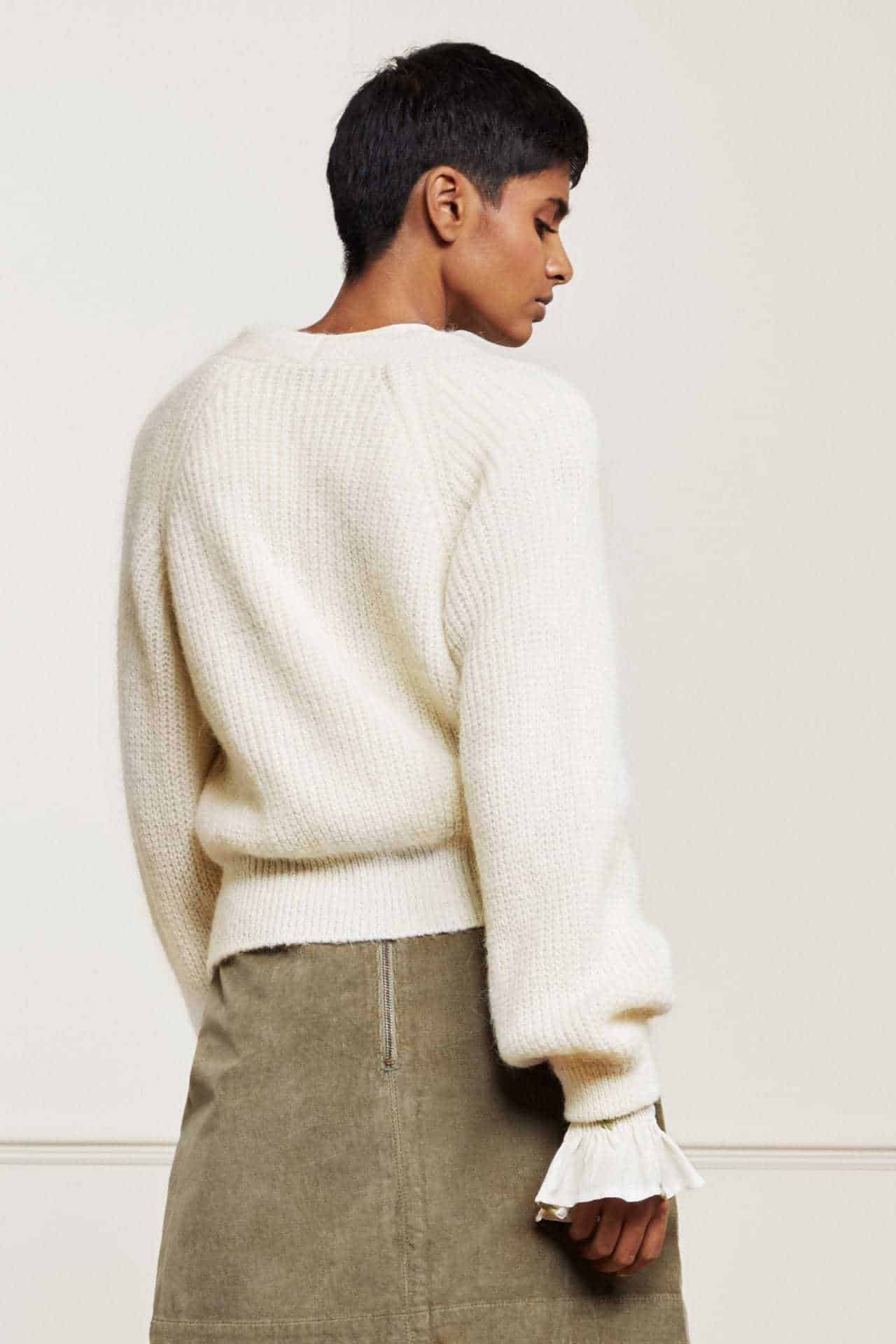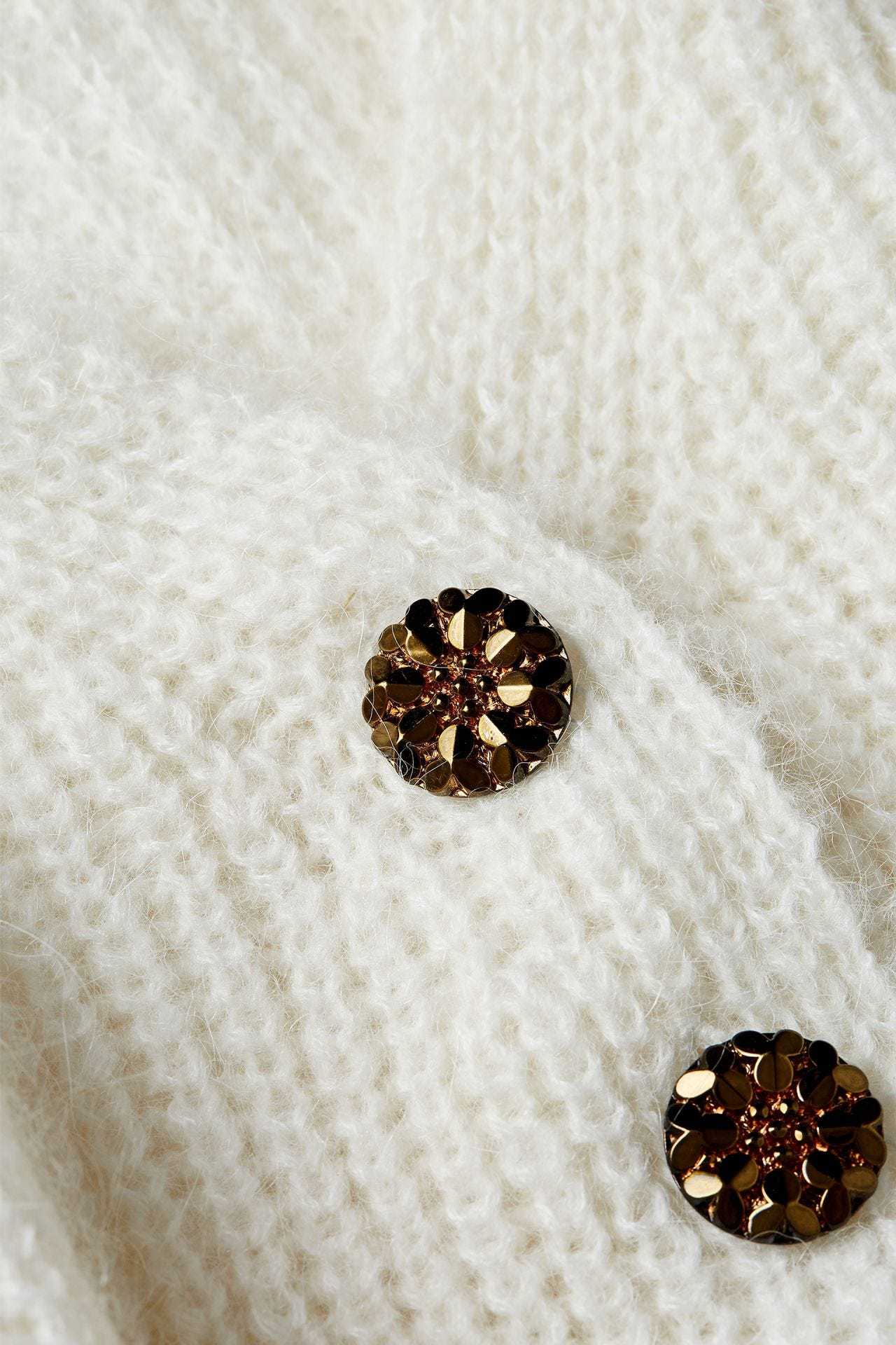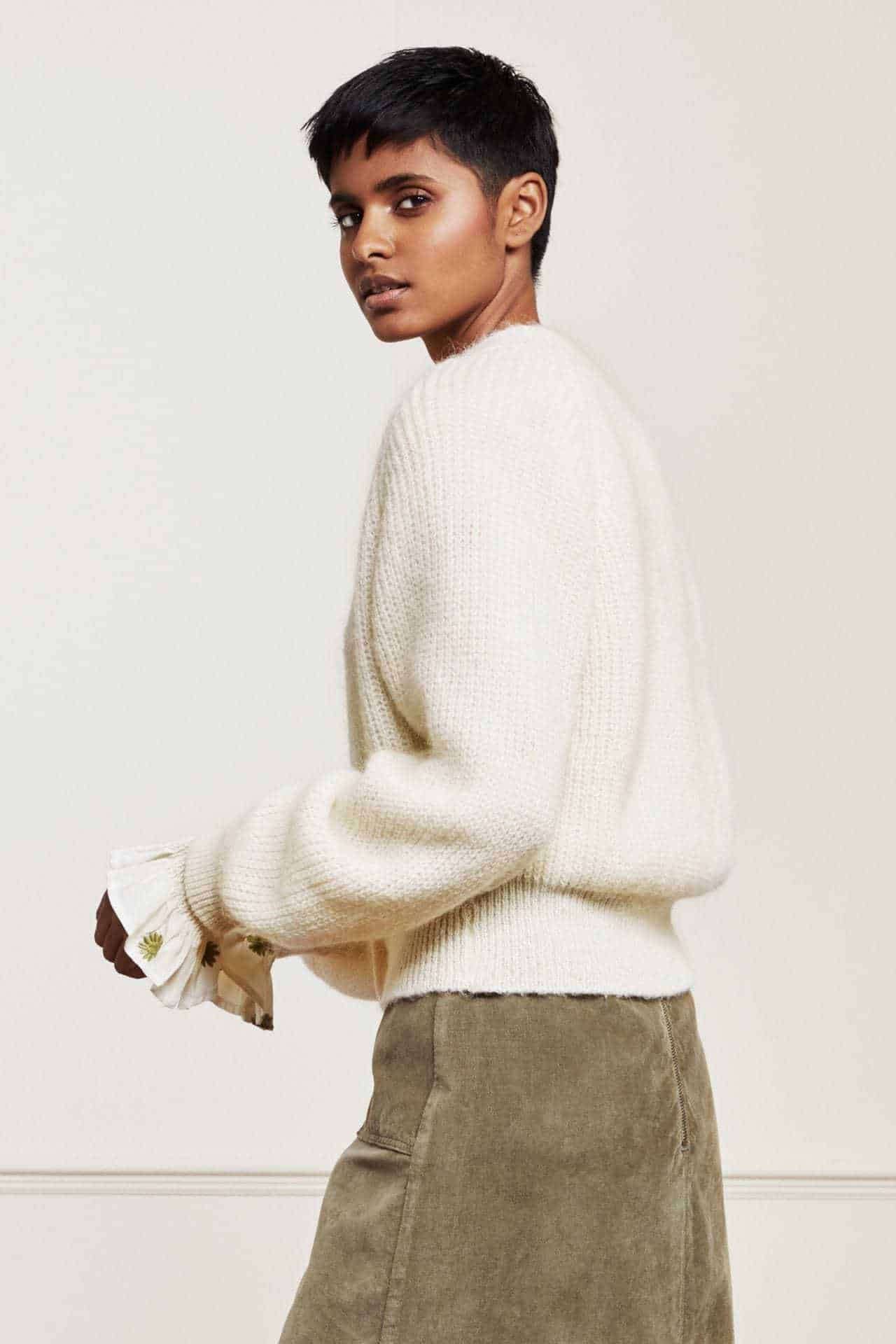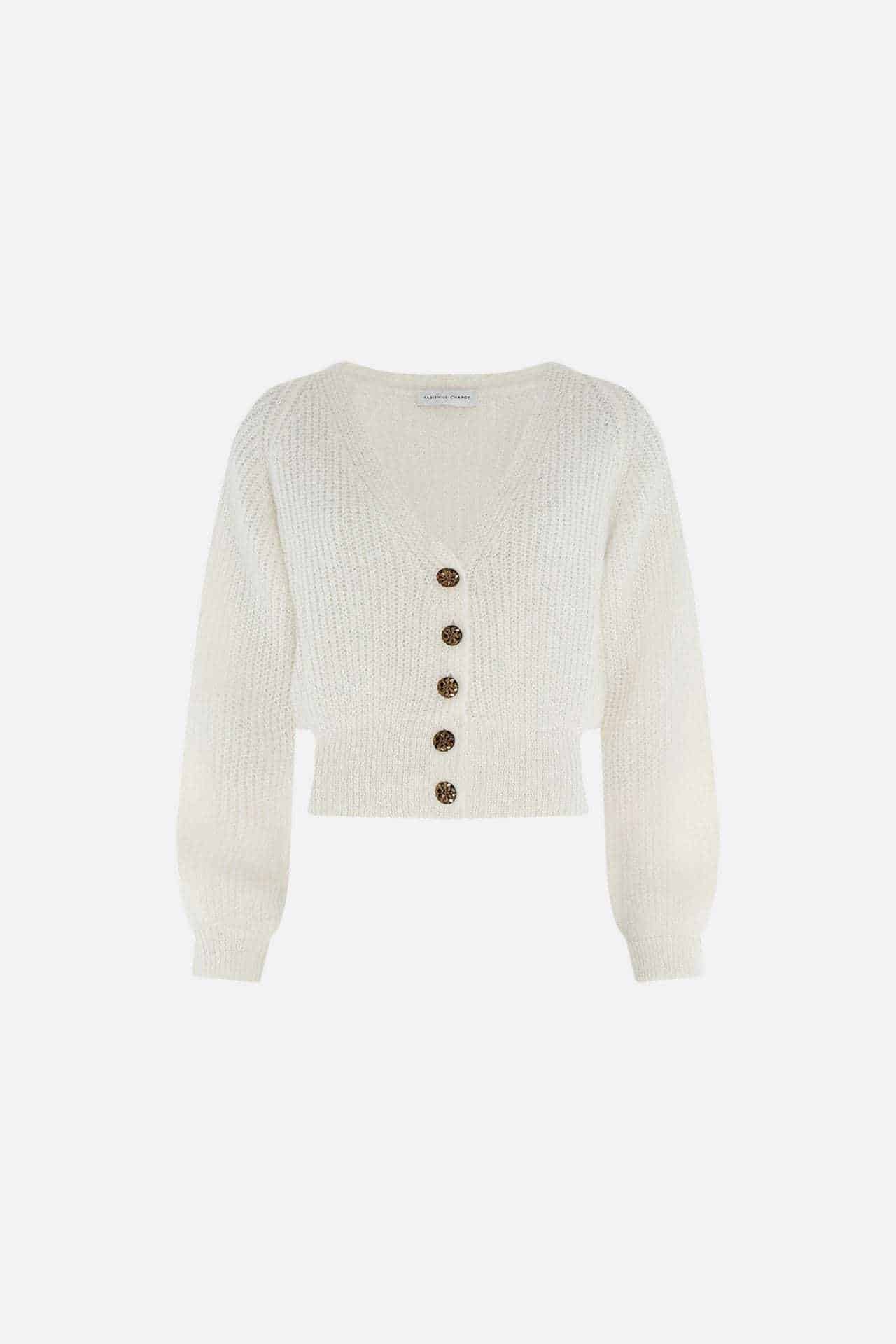 The Fabienne Chapot Starry cardigan in cream white is one of the brands best selling cardigans. The V-neck knitted cardigan has a front button closure with beautiful ornate bronze buttons and slightly puffed sleeves. This will quickly become a wardrobe staple throughout the summer months, perfect for throwing on when it gets a bit cooler, it looks lovely styled over dresses or with denim.