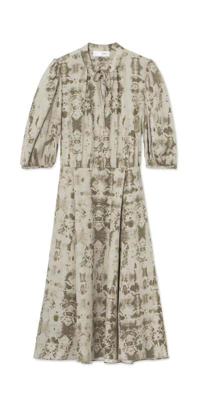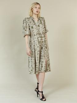 This Storm & Marie Louise Midi Dress in Olive Reptile is a midi dress with medium puff sleeves, puff shoulders and V-neck. Featuring a cut-line waist with pleat effect and tie-string at neck.The digital batik print is on a fabric made of TENCEL Lyocell, the certified sustainable fabric consisting of upcycled wood fibers, giving a smooth and soft feel.