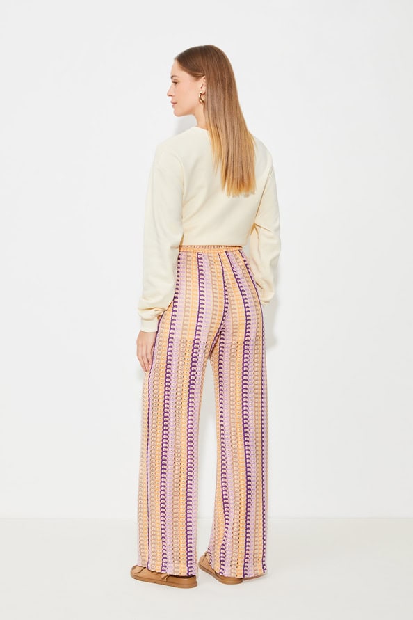 The Suncoo Jungle crochet effect striped wide pants in beige are the perfect trousers to see you through summer. Missoni inspired, these crochet trousers feature tonal stripes, wide legs and an elasticated waistband to ensure extra comfort. The crochet effect is perfect for holidays, just style with the co-ordinating Latoya top for an elevated holiday look or style with a quirky t-shirt for a stylish casual outfit.