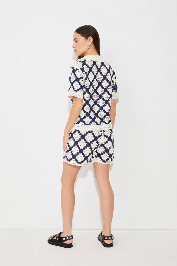 The Suncoo Perisol Two Tone Crochet Polo Jumper in dark blue is a stunning short sleeve crochet jumper perfect for teaming with jeans or skirts for a stylish summer look. Made from a cotton mix, with a collar and two tone crochet in blue and cream this top is the the perfect alternative to a t-shirt for those sunny days.
