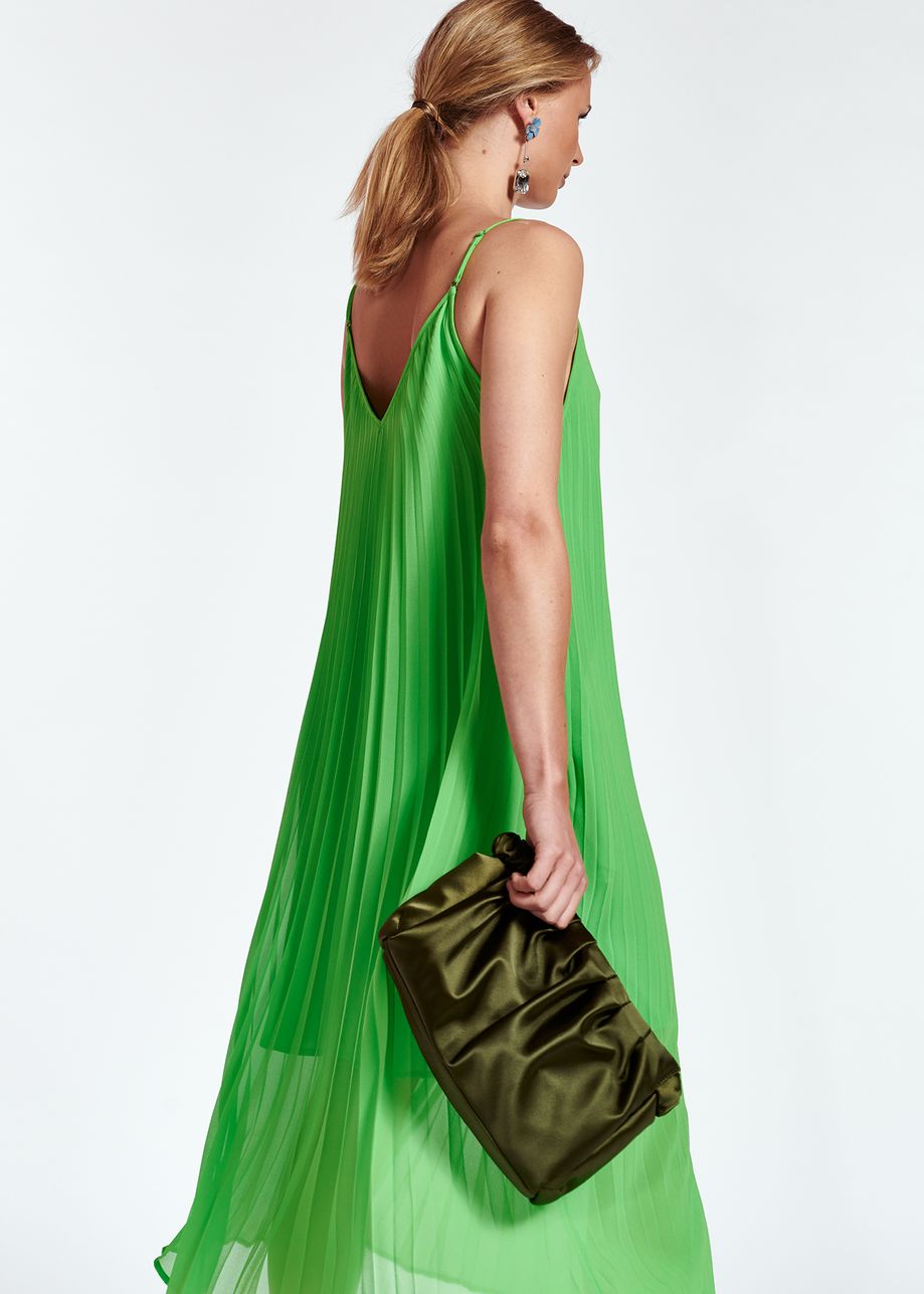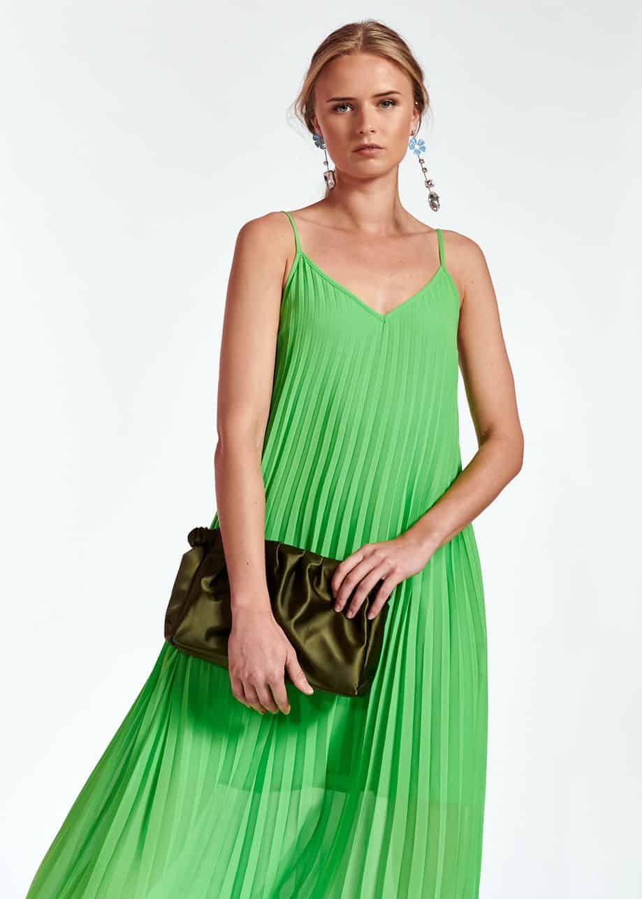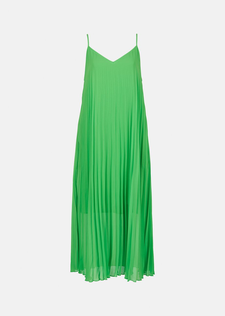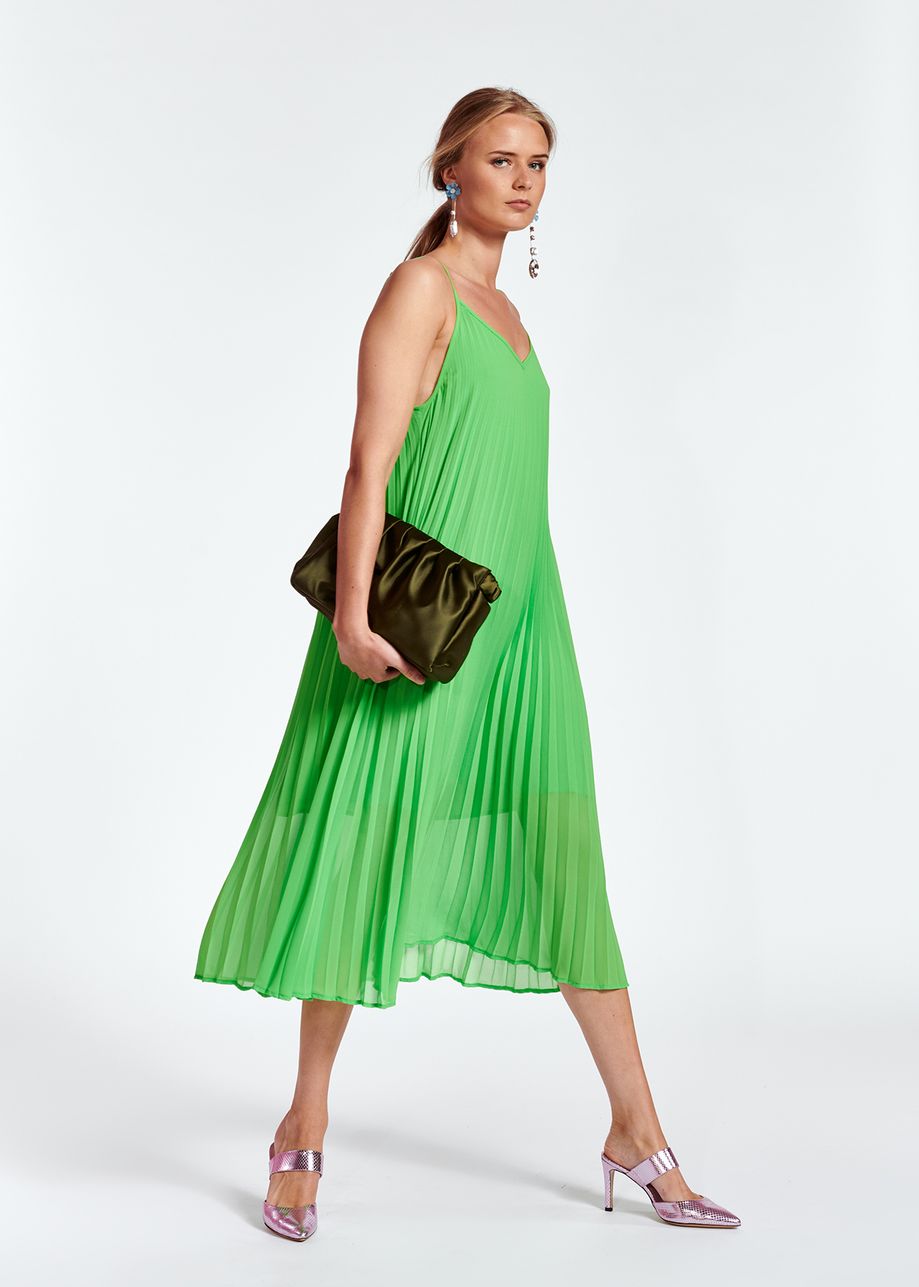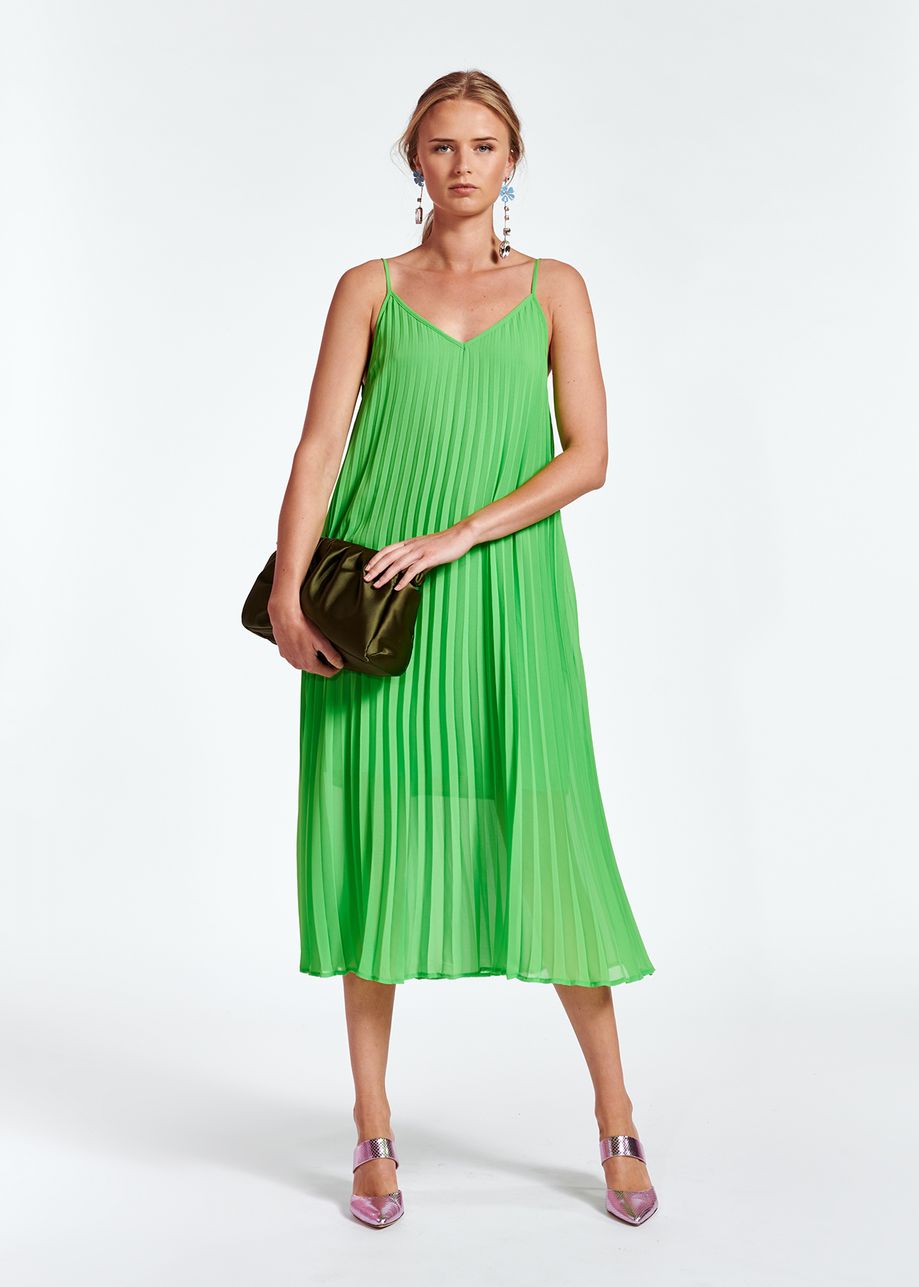 The Essentiel Antwerp Zague Pleated Slip dress in flash lime is a stunning midi length plissé dress that has a slip silhouette and thin adjustable straps. The bright green colour and beautiful pleating creates a seriously striking dress that would look great with D.A.T.E. trainers and the J Brand Drew denim jacket during the day and then on its own with heels for nights out. This dress is one that will get everyone's attention so not for the faint hearted.